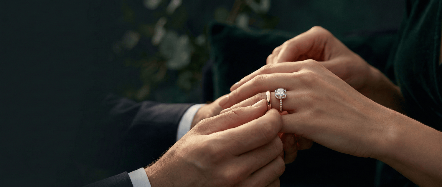 Most people wear both rings on their left ring finger, following the ancient "vena amoris" tradition. The wedding band typically goes on first during the ceremony, positioned closest to the heart. After marriage, the engagement ring sits above the wedding band in the conventional arrangement. This order symbolizes the progression from engagement to marriage while keeping both rings secure.