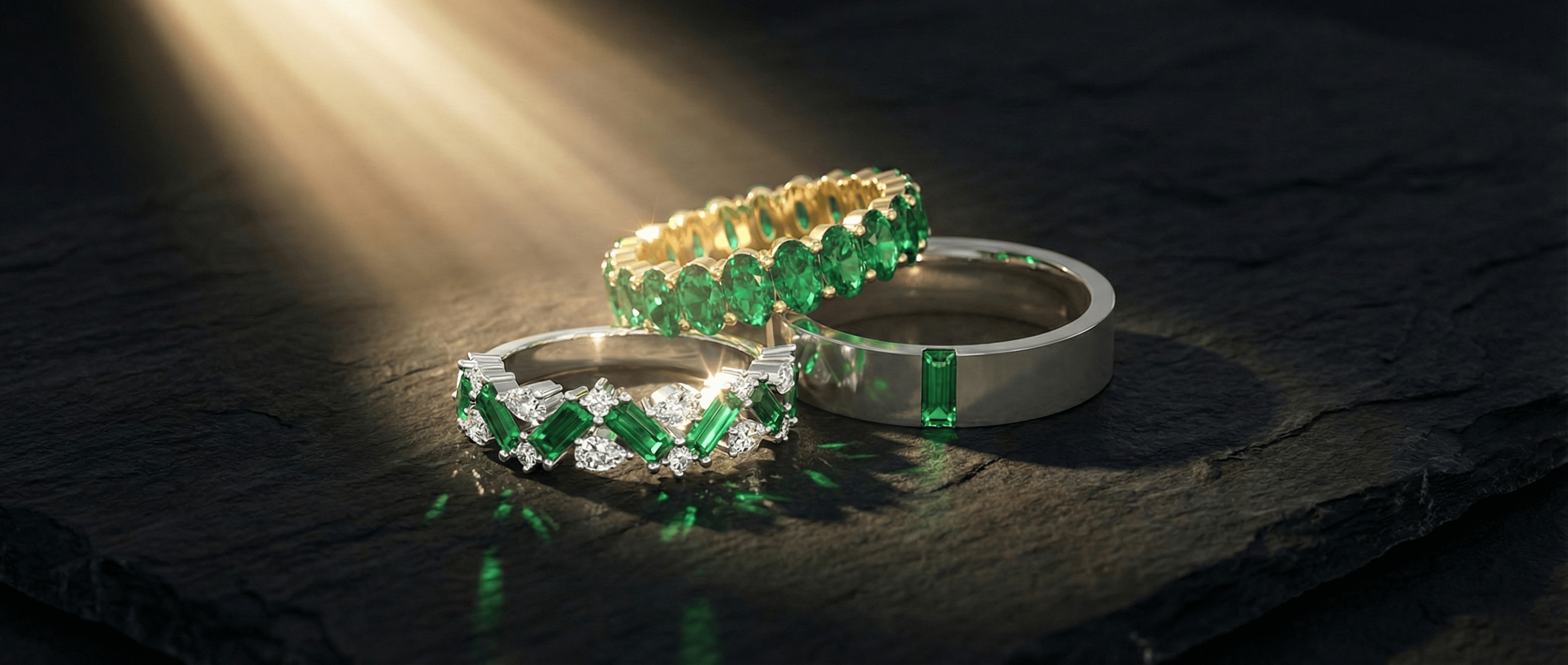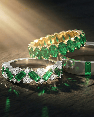 An emerald band combines timeless elegance with vibrant green brilliance, making it a meaningful choice for weddings, anniversaries, and everyday luxury. Featuring natural emerald gemstones set in refined gold or platinum, these bands symbolize renewal, love, and lasting commitment. Our emerald band collection includes classic wedding bands, eternity bands with continuous emerald settings, stackable designs, and anniversary rings crafted for both modern and vintage-inspired tastes. Whether worn alone or paired with an engagement ring, an emerald band adds rich color and sophistication to any jewelry collection. Each band is expertly crafted to ensure durability, comfort, and enduring beauty.