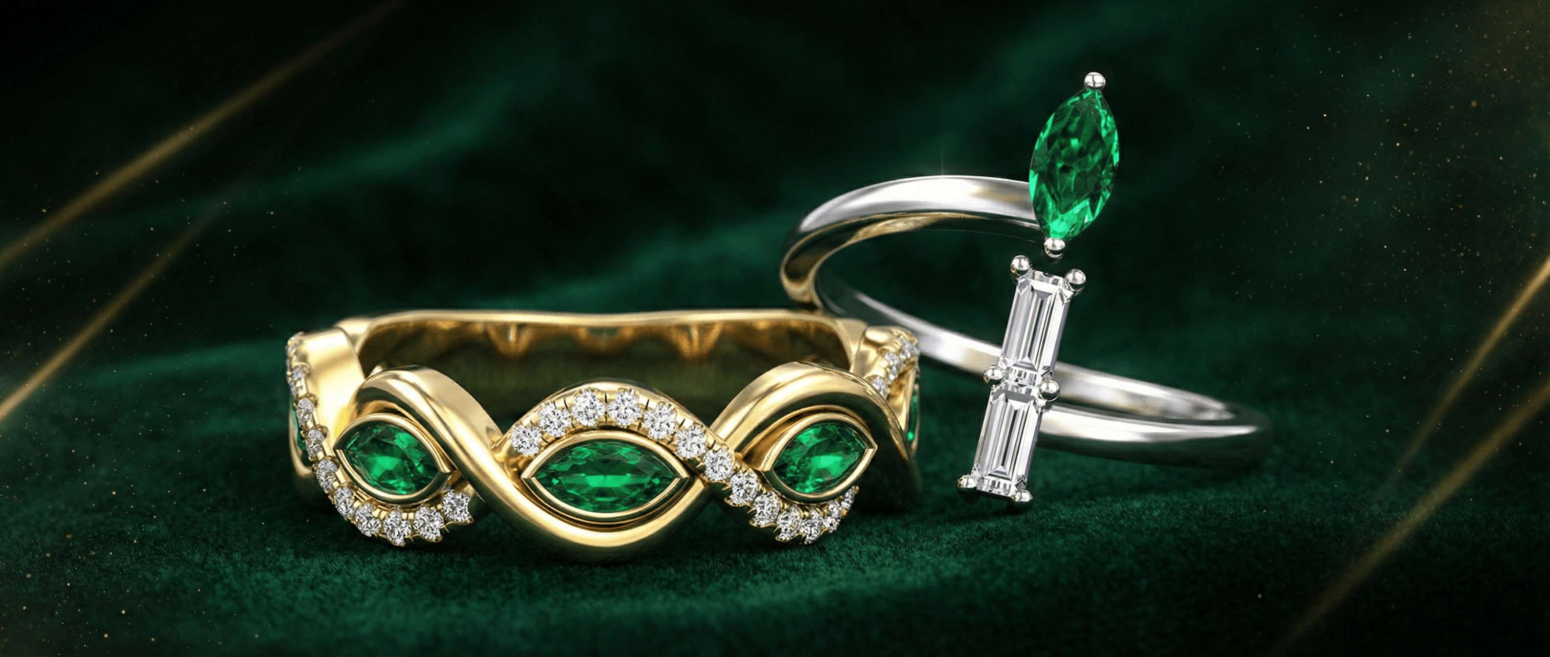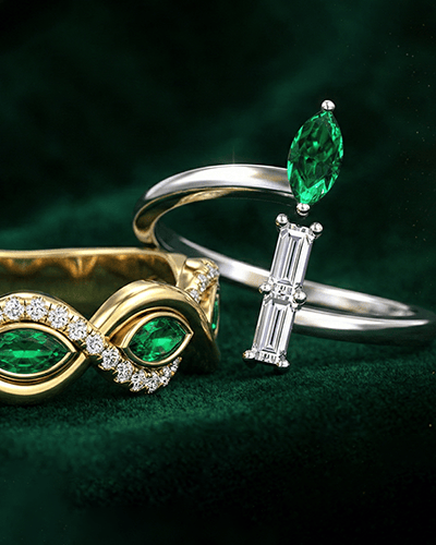 A marquise emerald ring showcases a distinctive elongated shape that enhances the gemstone’s brilliance and creates a flattering, finger-lengthening effect. The marquise cut, known for its pointed ends and elegant silhouette, highlights the vibrant green beauty of natural emeralds. Our collection features marquise emerald engagement rings, vintage-inspired halo designs, solitaire styles, and rings accented with diamonds. Available in yellow gold, white gold, rose gold, and platinum, these rings combine timeless sophistication with unique character. Perfect for engagements, anniversaries, or statement jewelry, a marquise emerald ring offers refined elegance with a bold, eye-catching design.
