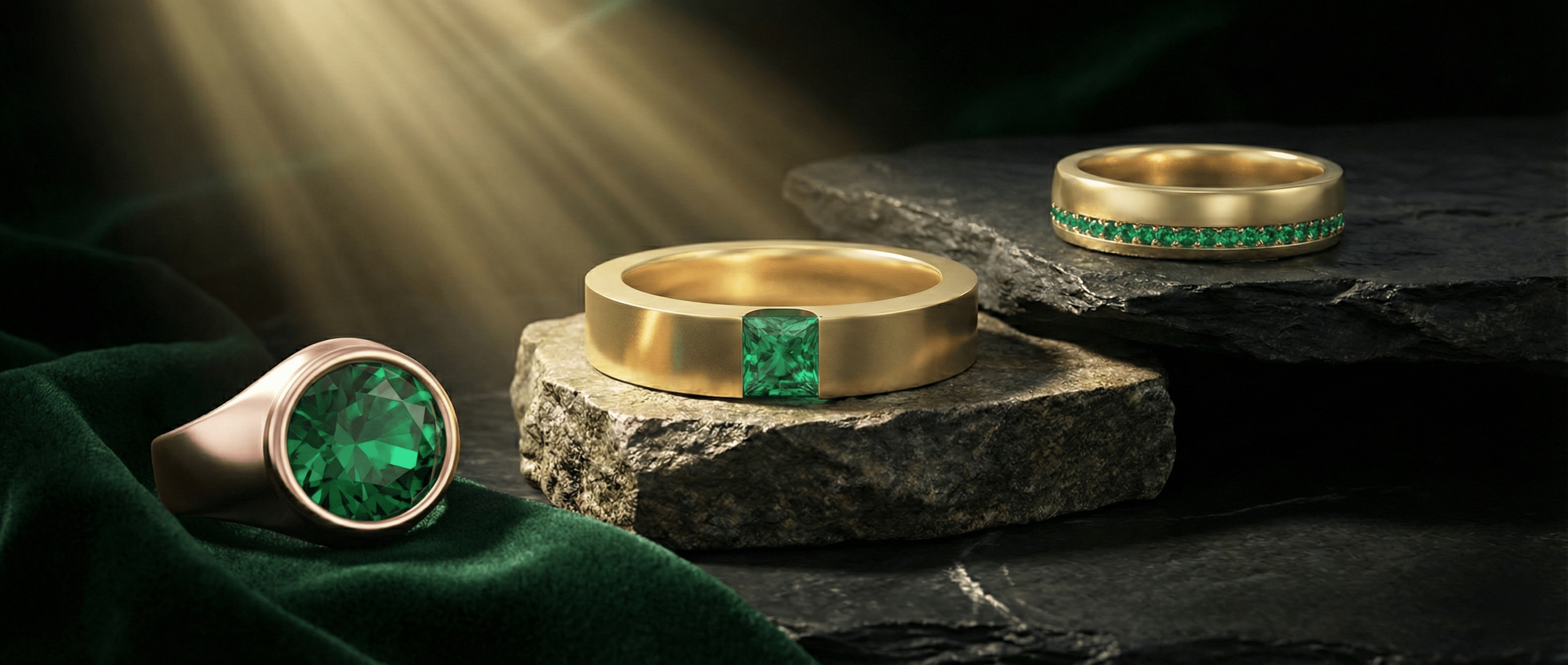 Men’s real emerald rings showcase the bold elegance and natural beauty of genuine green gemstones. Known for symbolizing strength, prosperity, and renewal, emerald has long been admired in men’s fine jewelry for its rich color and timeless appeal. Our collection features certified natural emerald rings for men crafted in yellow gold, white gold, rose gold, and platinum. Explore classic signet rings, bold statement designs, minimalist bands, and emerald rings accented with diamonds. Each gemstone is carefully selected to ensure authenticity, vibrant color, and lasting quality. Whether worn as a fashion statement, a meaningful gift, or a signature piece, men’s real emerald rings combine masculine design with refined sophistication.