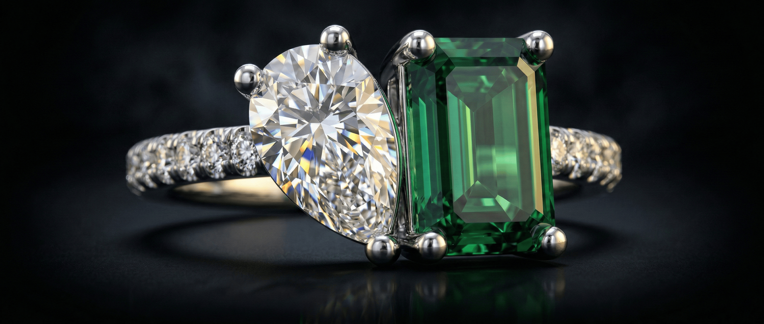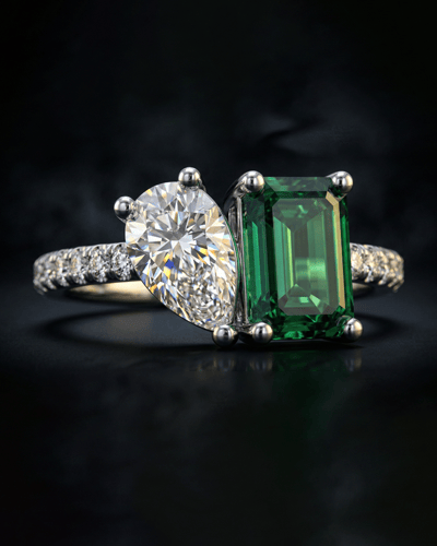 A moissanite and emerald ring combines the vibrant green beauty of emerald with the exceptional brilliance of moissanite. This striking gemstone pairing offers a unique alternative to traditional diamond designs while delivering remarkable sparkle and timeless elegance. Our collection features emerald and moissanite engagement rings, halo settings, vintage-inspired styles, and contemporary solitaire designs. Available in yellow gold, white gold, rose gold, and platinum, each piece is crafted to highlight the vivid color contrast between the rich emerald center stone and the radiant moissanite accents. Perfect for proposals, anniversaries, or meaningful gifts, moissanite and emerald rings offer durability, brilliance, and bold sophistication at an attractive value.