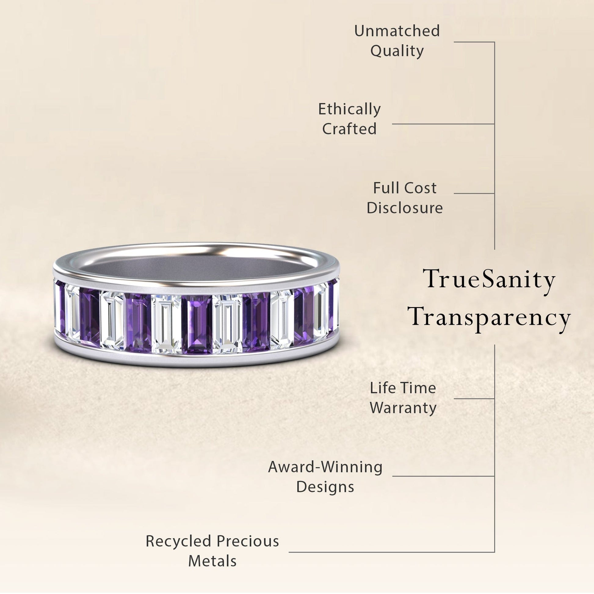 A mesmerizing blend of deep purple amethyst and dazzling white diamonds, the Kyra Baguette Eternity Band features a sleek channel-set design. Crafted in your choice of white gold, rose gold, yellow gold, or blackened gold, this timeless ring offers a sophisticated and modern aesthetic, perfect for stacking or wearing solo.