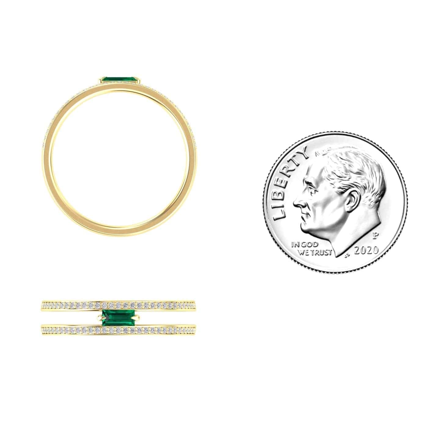The Emerald & Diamond Double Band - Bianca is a striking fusion of elegance and modern design. A radiant baguette-cut emerald sits at the center, framed by two parallel bands adorned with shimmering diamonds. Crafted in 14K White Gold, Rose Gold, Yellow Gold, and Blackened Gold, this exquisite ring is perfect for those who appreciate timeless luxury with a contemporary edge.