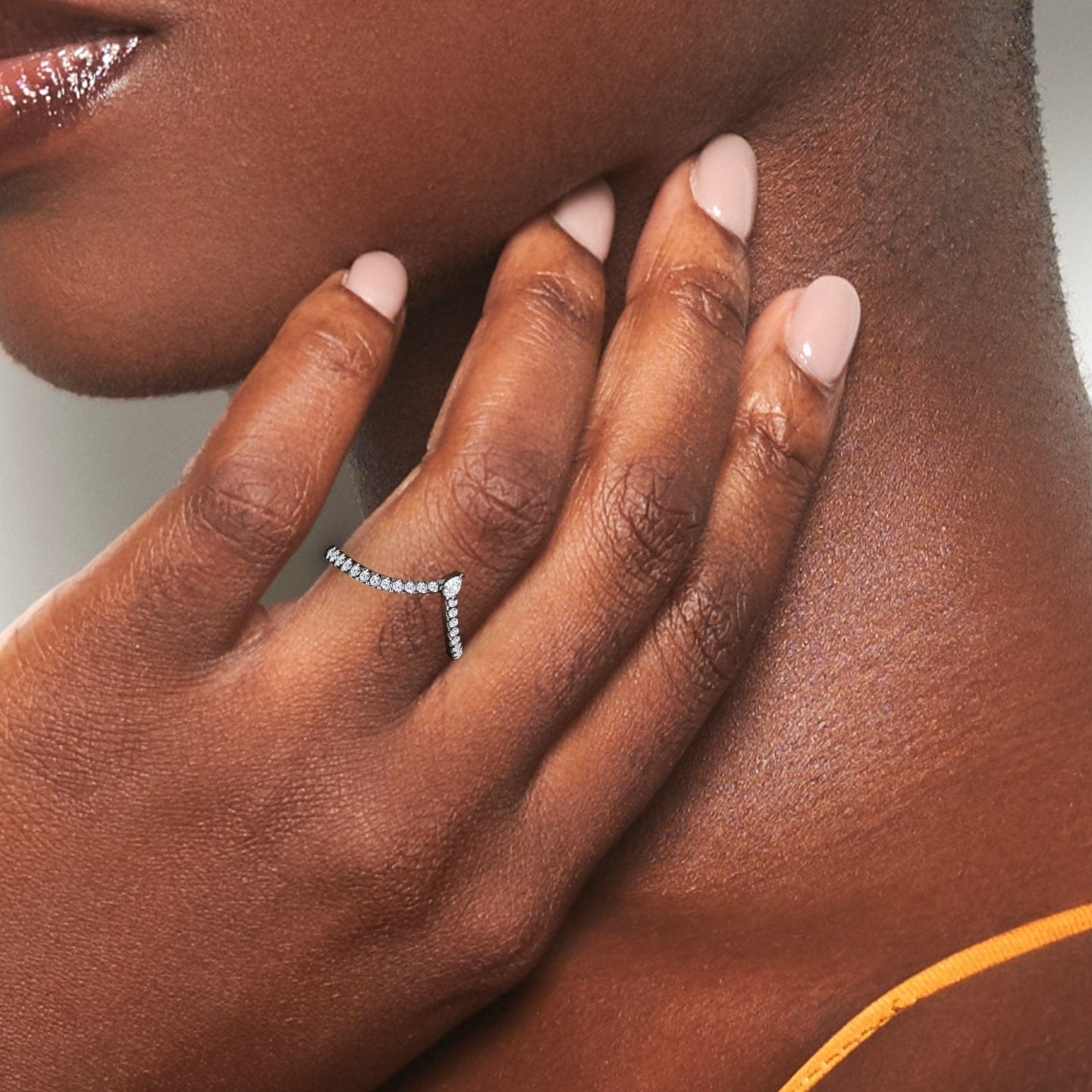 Sleek and sculptural, the Classic Chevron Wedding Band – Anisa adds a modern twist to a timeless silhouette with its graceful V-shape design. Available in your choice of 18K white, rose, yellow, blackened gold, or platinum—perfect for stacking or wearing solo.