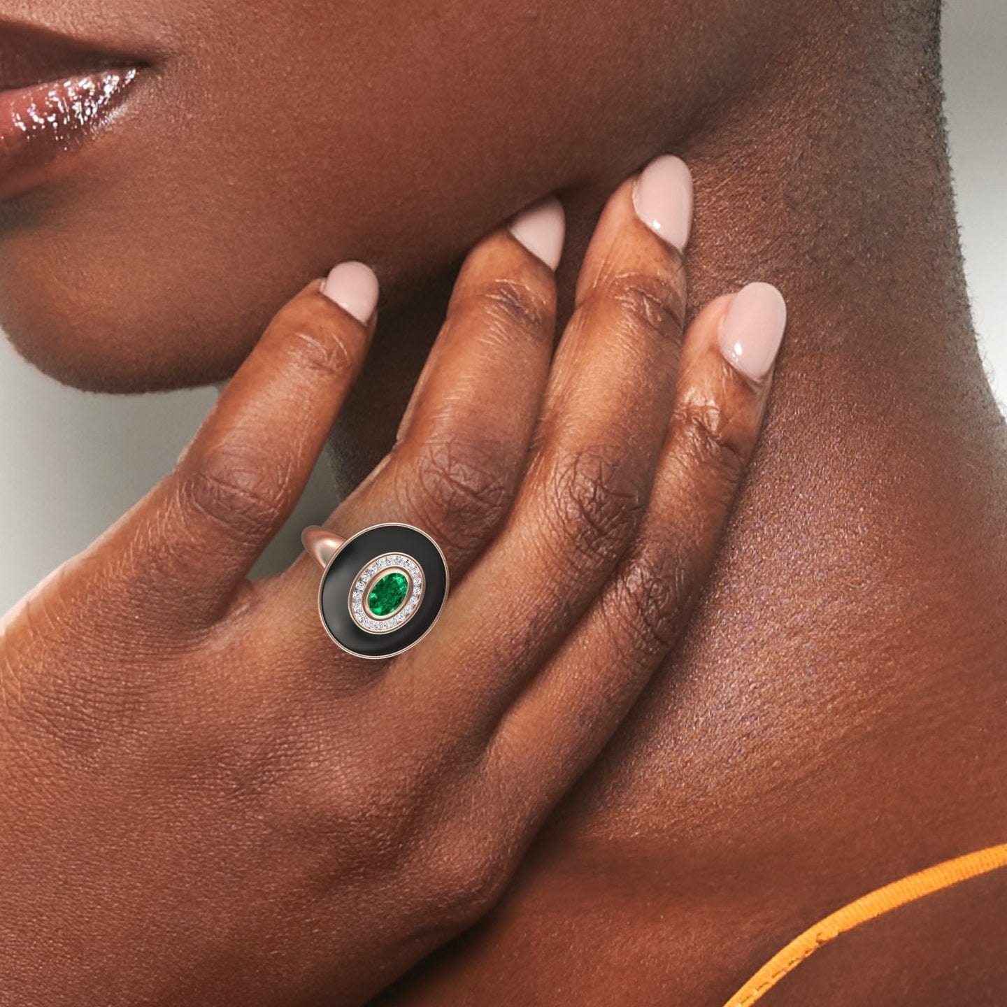 Elevate your style with the Camille Emerald & Diamond Black Enamel Halo Ring, featuring a captivating oval-cut emerald at its center, encircled by a brilliant round diamond halo. The sleek black enamel finish enhances the vintage-inspired design, making this ring a true statement piece. Available in White Gold, Rose Gold, Yellow Gold, and Blackened Gold, it’s the perfect blend of elegance and bold sophistication.