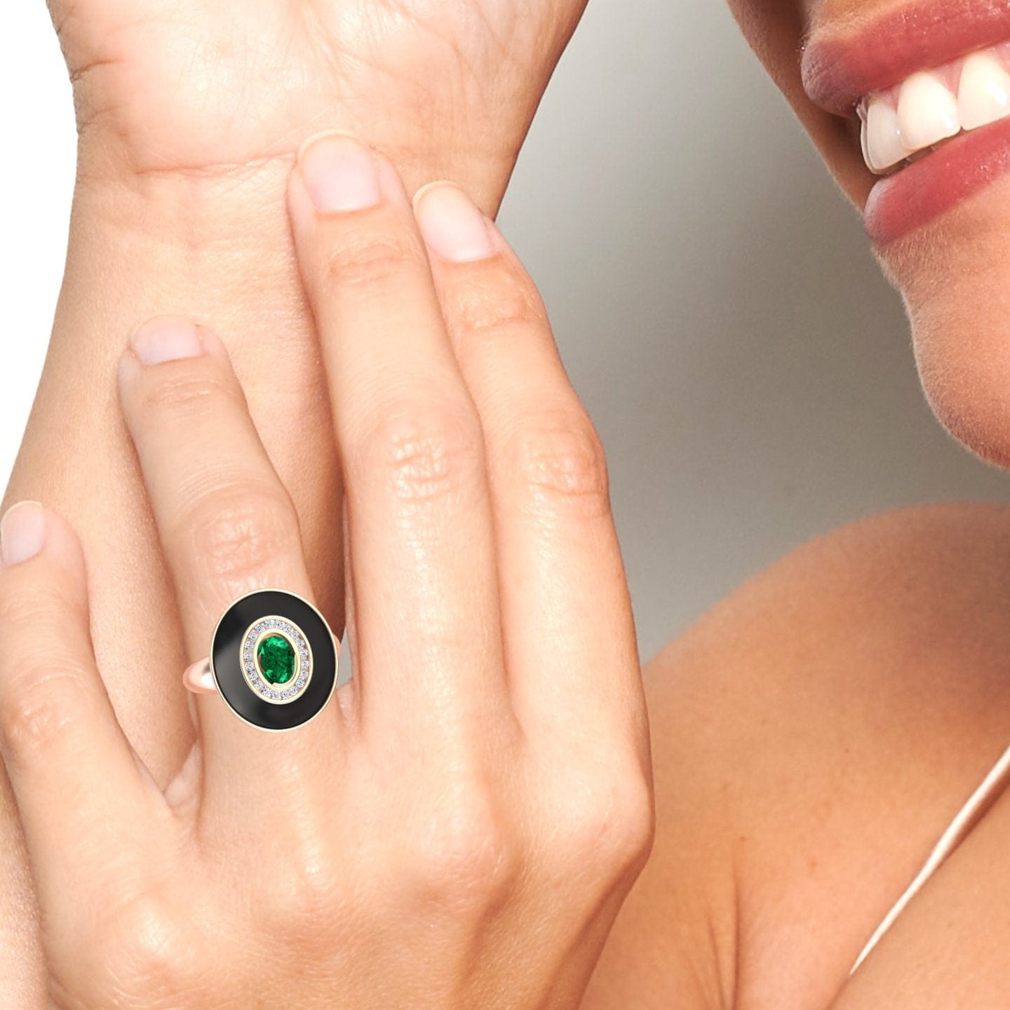 Emerald & Diamond Black Enamel Halo Ring - Camille
