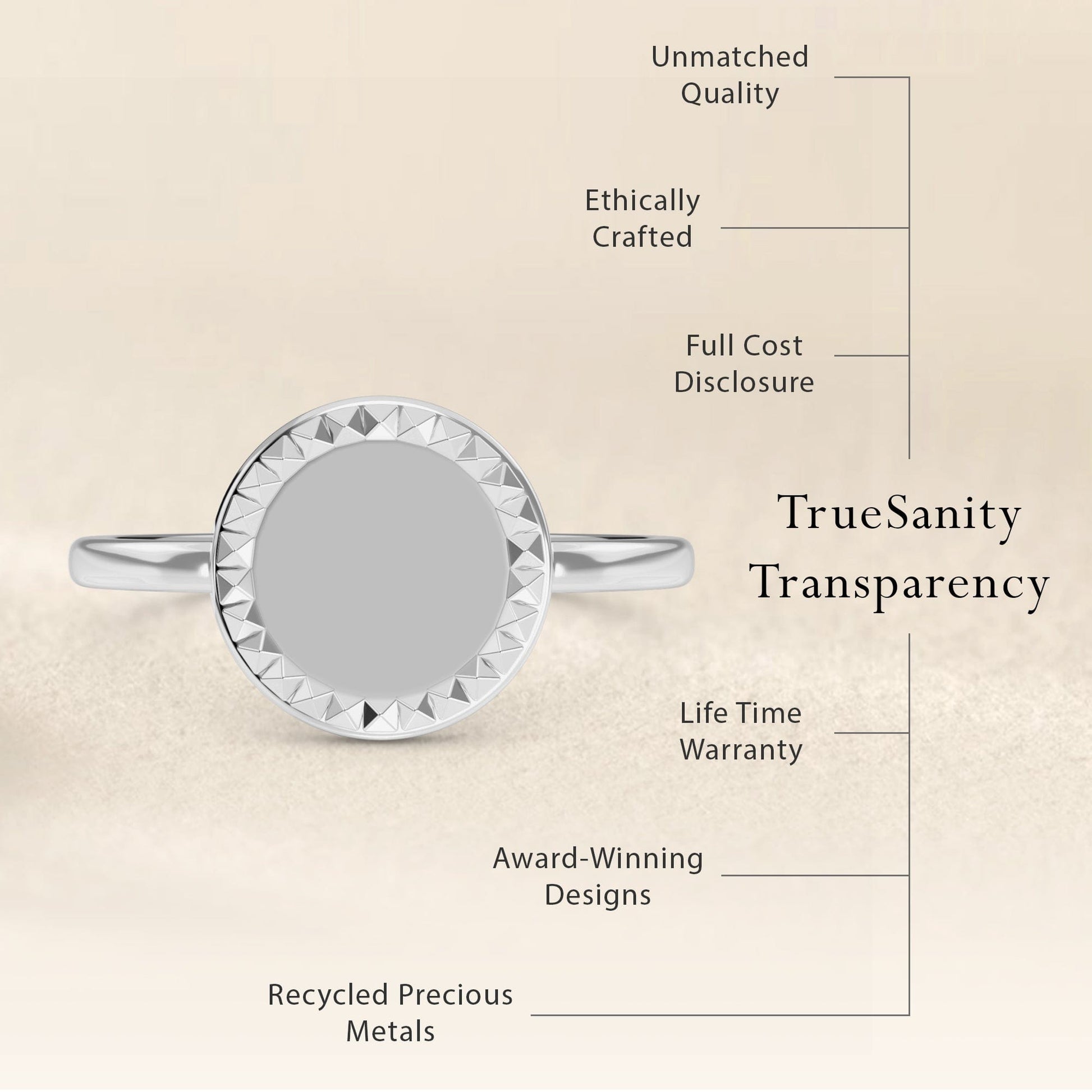 Legal Disclaimer: The information regarding our costing, material sourcing, craftsmanship, and other operational details is provided for transparency purposes only. While True Sanity strives for utmost accuracy and diligently verifies all data, this information is not intended as a legally binding representation or warranty. Market prices for precious metals (including gold) and diamonds are subject to significant and rapid fluctuations, which are beyond our control. All cost breakdowns and appraisals are based on market conditions at the time of calculation. Furthermore, despite rigorous quality control and data verification processes, human error remains a possibility. True Sanity reserves the right to correct any errors, inaccuracies, or omissions, and we will do so promptly upon identification. This disclosure does not create any contractual obligations beyond those expressly set forth in our official terms of sale, warranty, and return policies. Your use of our website and purchase of our products are subject to our full Terms and Conditions.