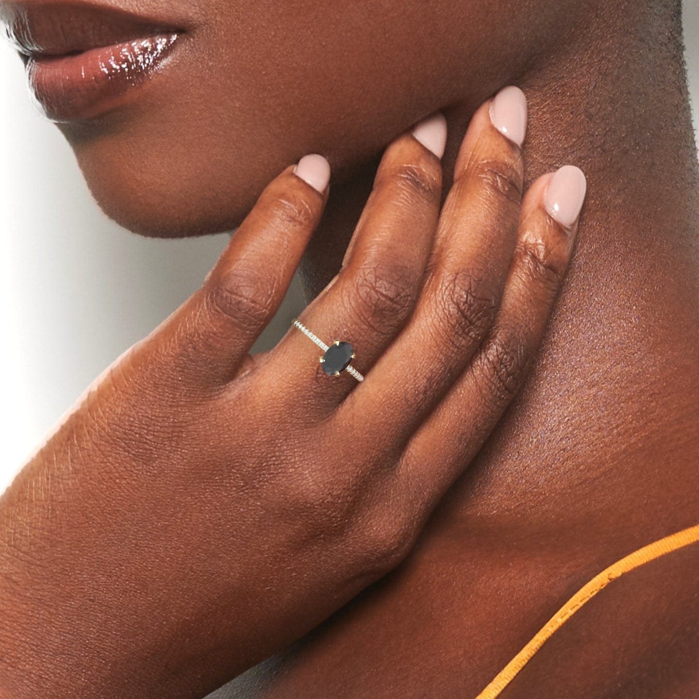 The Tamara engagement ring features a striking 1 carat oval certified natural black diamond, subtly enhanced by a hidden halo and a shimmering pave band of round diamonds. Choose your bold statement in 18k white gold, rose gold, yellow gold, or blackened gold for a sophisticated and unique symbol of your love.