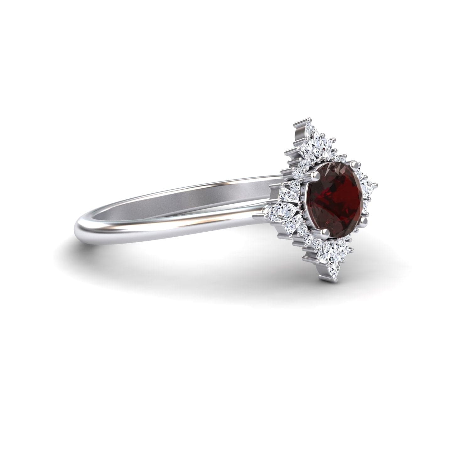 Radiate elegance with the Garnet & Diamond Vintage-Inspired Starburst Ring - Delia, featuring a rich round garnet center stone framed by sparkling white diamonds in a unique starburst design. A perfect blend of timeless luxury and modern sophistication, this exquisite ring is available in white gold, rose gold, yellow gold, and blackened gold. Ideal as a statement ring, anniversary gift, or a luxurious addition to any fine jewelry collection.