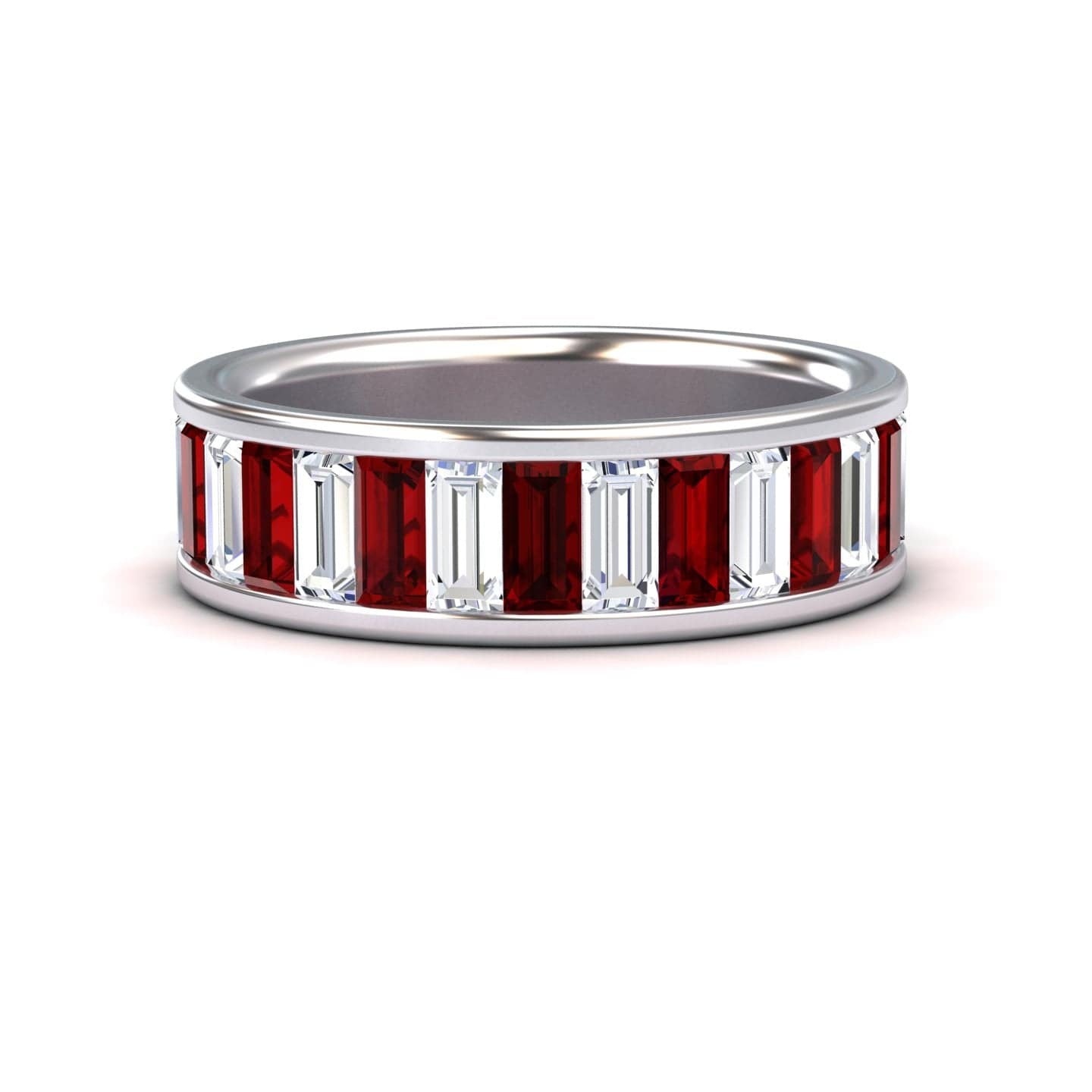 Bold and timeless, the Kyra Baguette Eternity Band features deep red garnets paired with sparkling white diamonds in a sleek channel-set design. The rich hues of garnet symbolize passion and strength, making this ring a perfect choice for everyday elegance or as a meaningful gift. Available in white gold, rose gold, yellow gold, or blackened gold, this eternity band is a stunning addition to any jewelry collection.