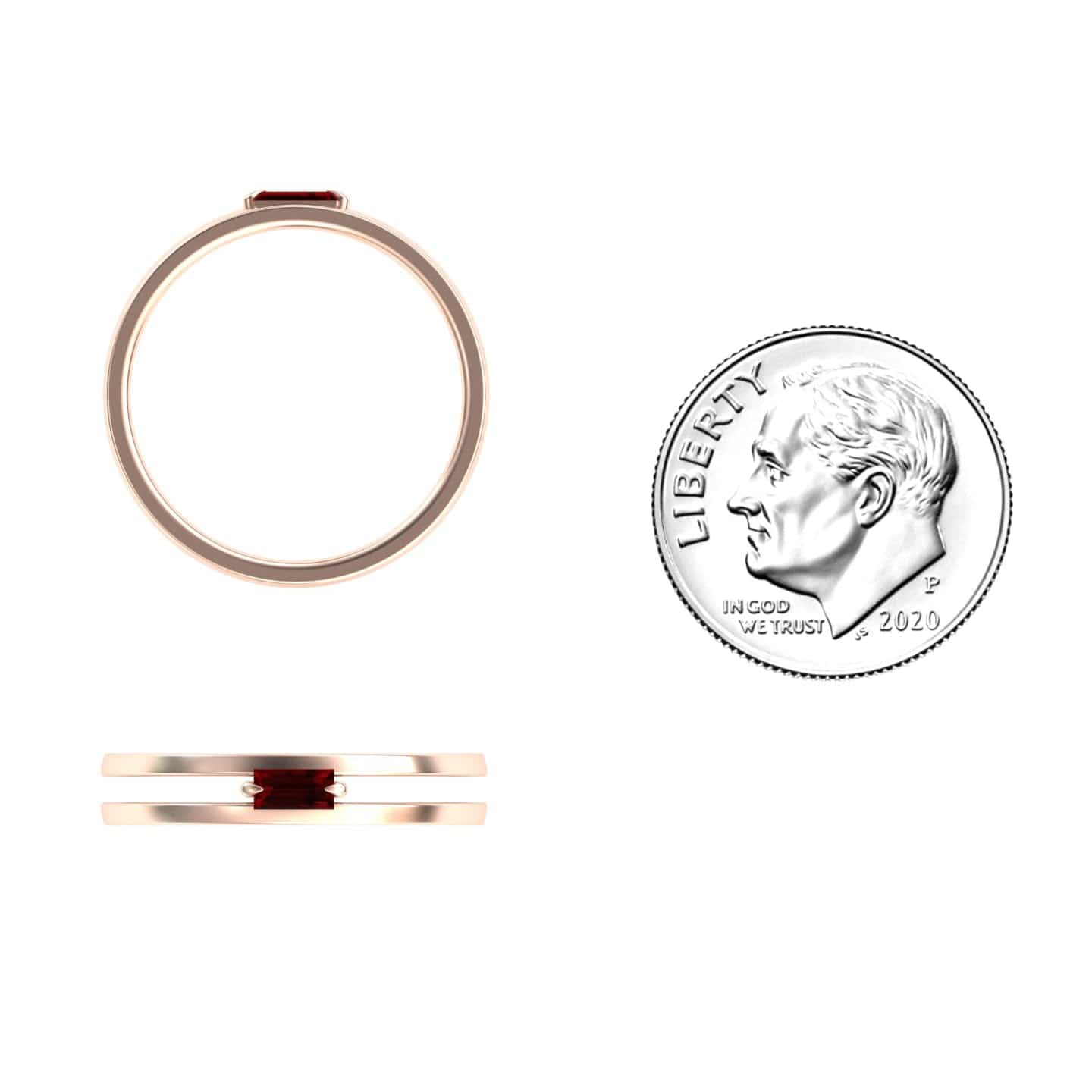 Bold and sophisticated, the Garnet Minimalist Double Band Ring - Alia features a striking baguette-cut garnet set between two sleek 14K gold bands. The deep red gemstone symbolizes passion and strength, making it an elegant statement piece for any occasion. Crafted for a modern yet timeless look, this ring is available in White, Rose, Yellow, or Blackened Gold to complement your personal style.