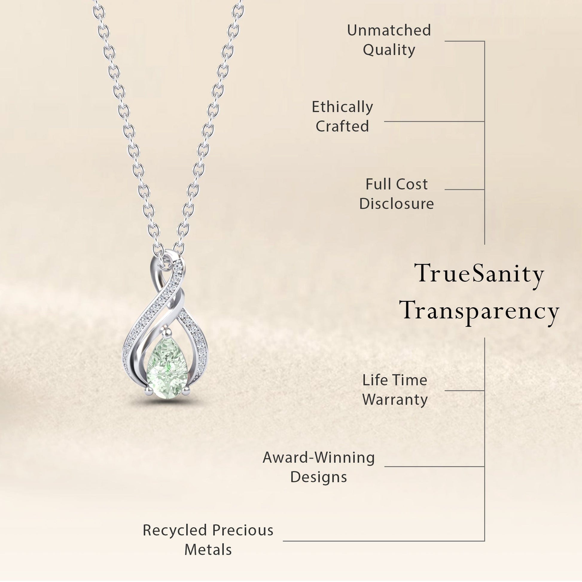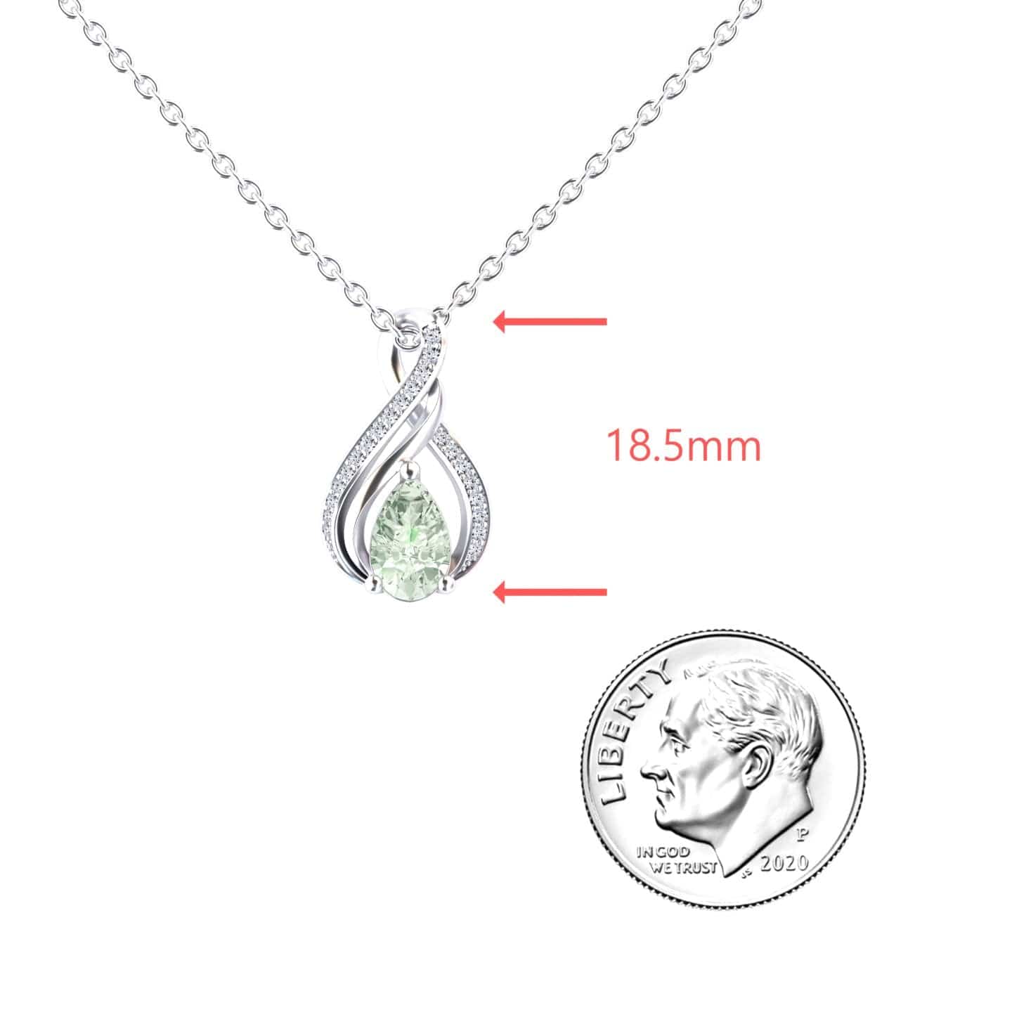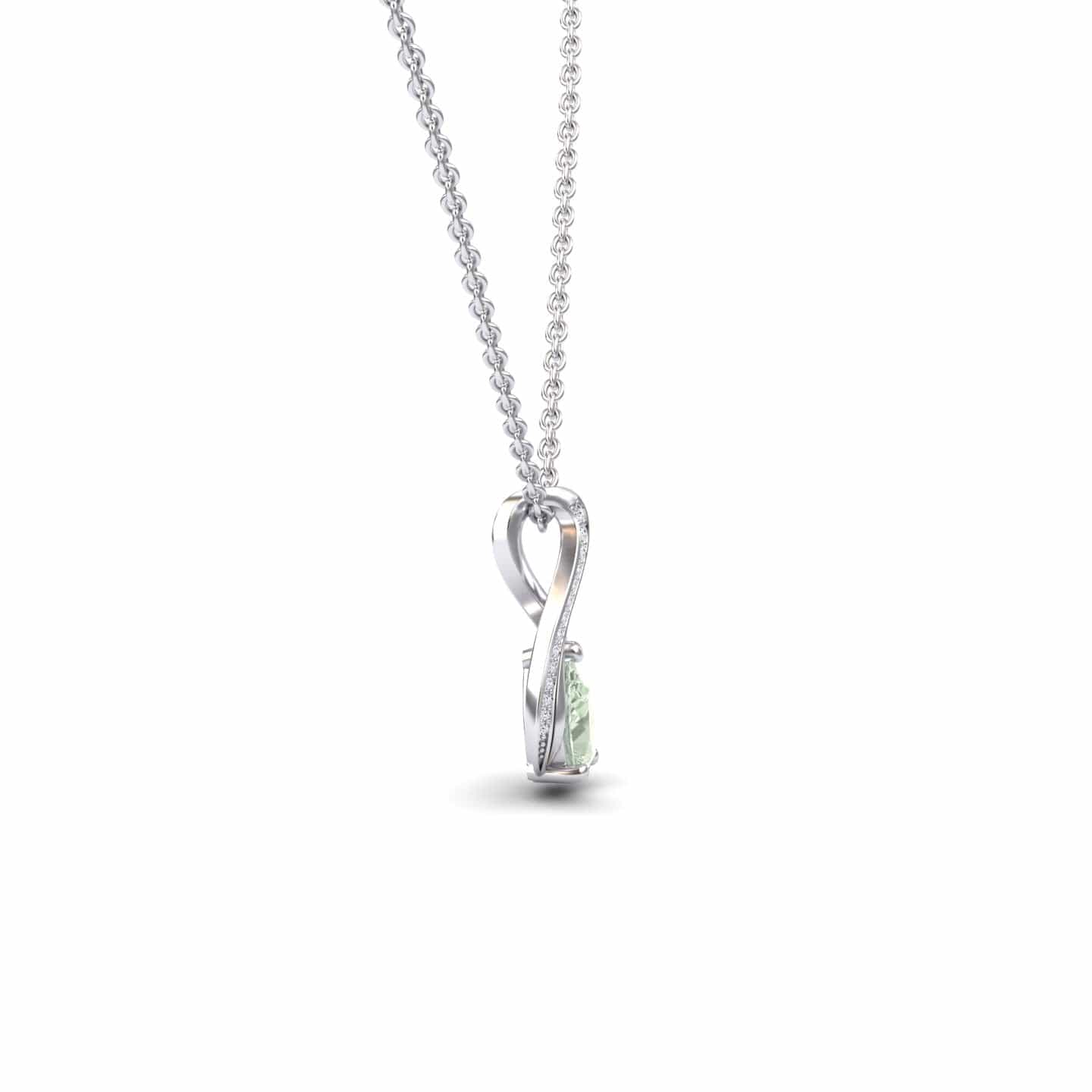 The Green Amethyst & Diamond Infinity Twist Necklace - Maddison exudes elegance with its soft green pear-shaped amethyst, beautifully cradled within a diamond-studded infinity twist. A symbol of timeless beauty and sophistication, this necklace is available in White Gold, Rose Gold, Yellow Gold, and Blackened Gold, making it a perfect addition to any jewelry collection.