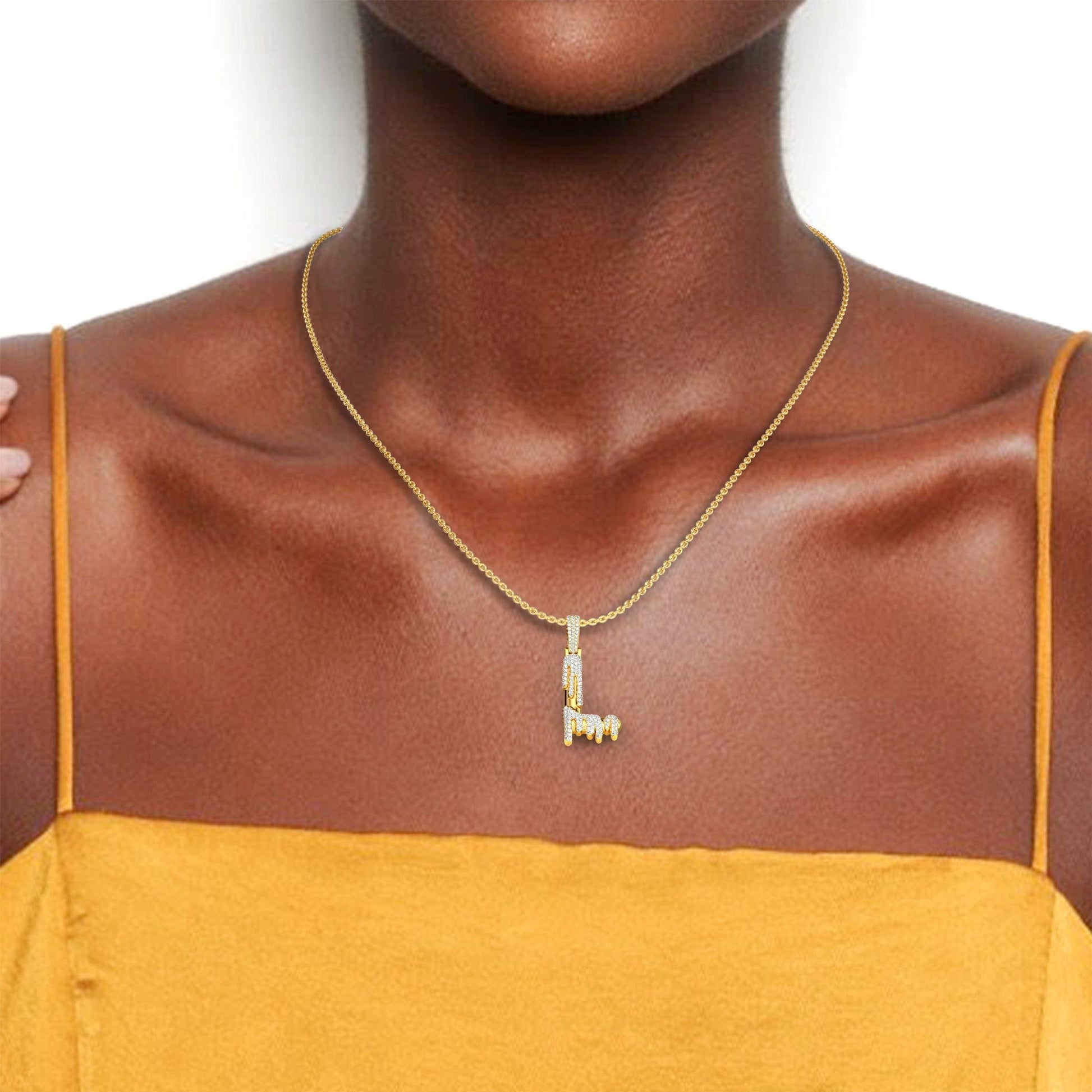 Make a bold statement with the L Initial Dripping Diamond Pendant Necklace - Lincoln, adorned with 172 round diamonds in a unique drip-inspired design. Crafted in your choice of White Gold, Rose Gold, Yellow Gold, or Blackened Gold, this eye-catching pendant is a luxurious and personalized addition to any jewelry collection.