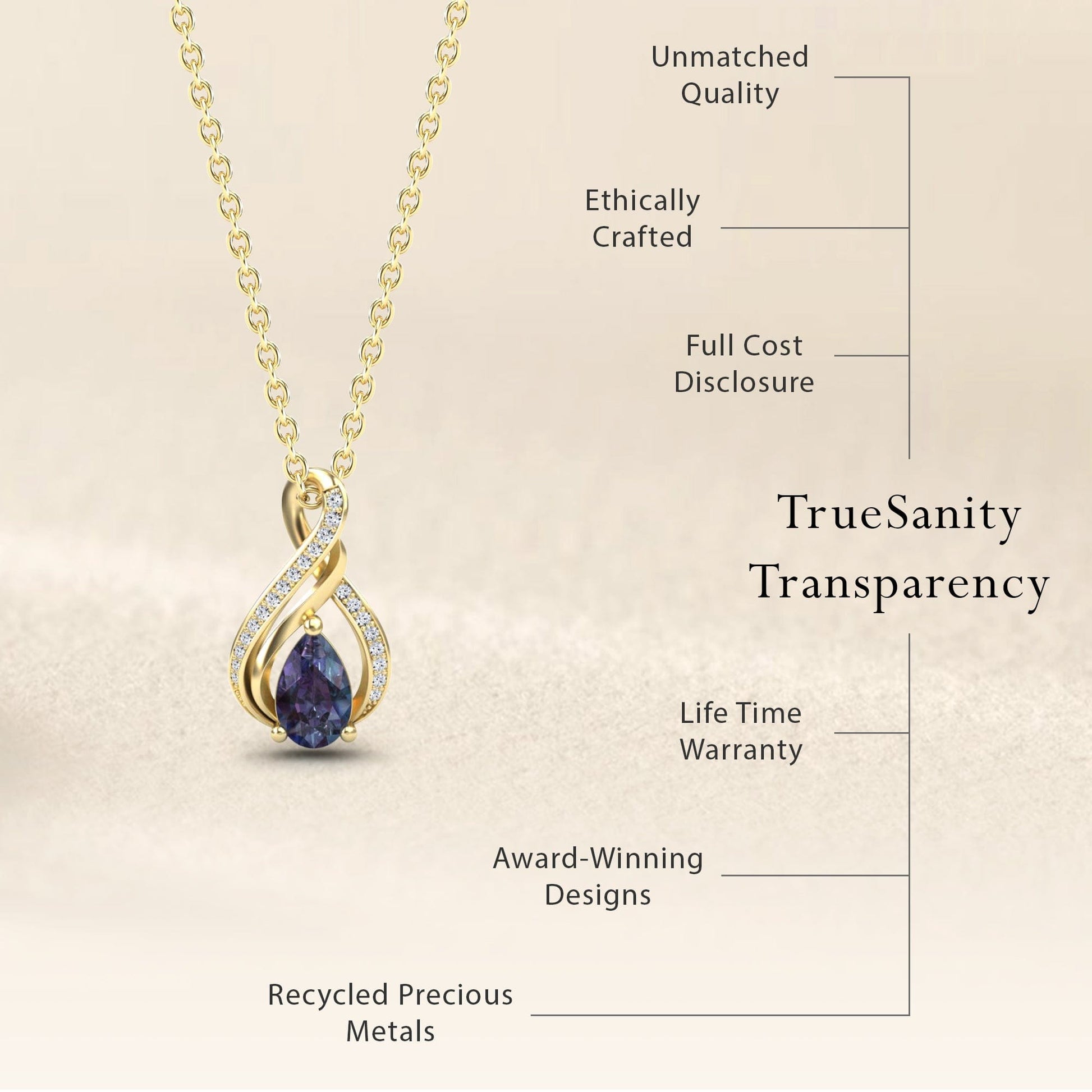 The Lab Grown Alexandrite & Diamond Infinity Twist Necklace - Maddison features a captivating pear-shaped lab-grown alexandrite that shifts colors beautifully under different lighting, symbolizing transformation and elegance. Framed by a shimmering diamond-studded infinity twist, this exquisite piece is available in White Gold, Rose Gold, Yellow Gold, and Blackened Gold, offering a timeless and versatile look for any occasion.