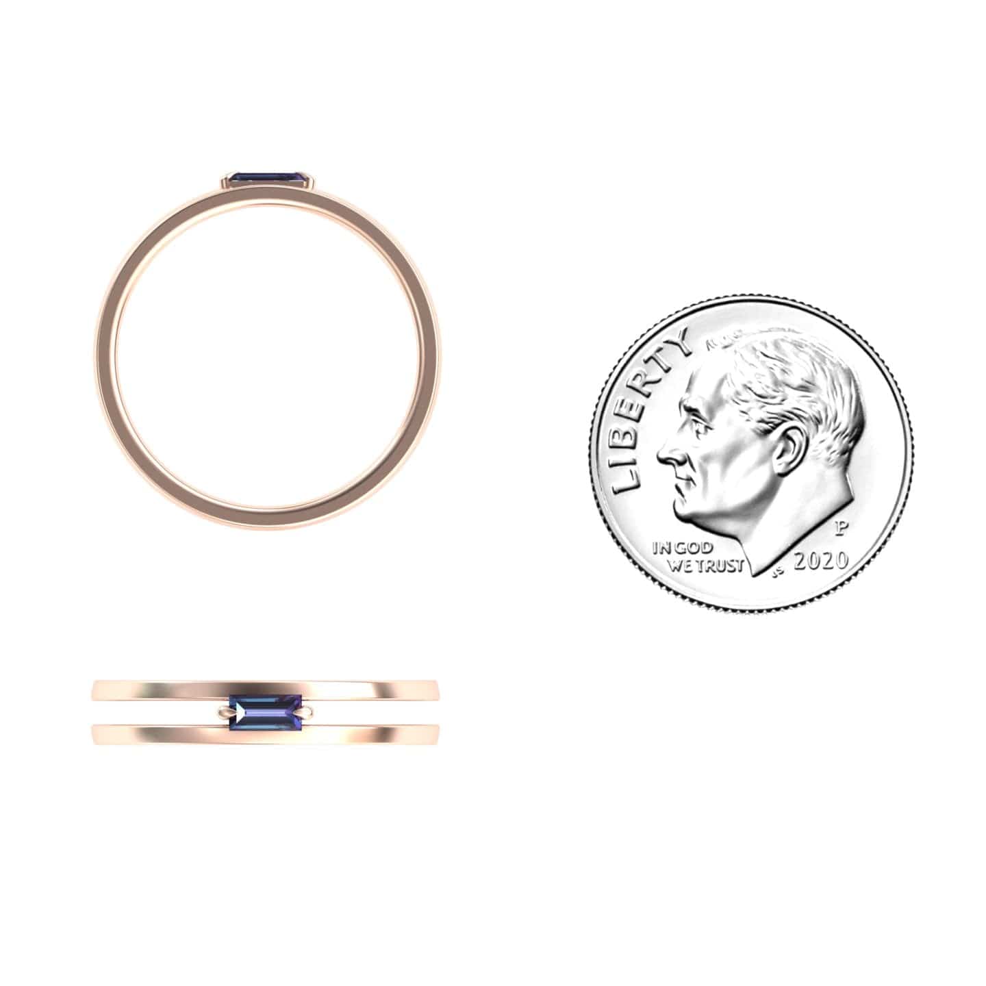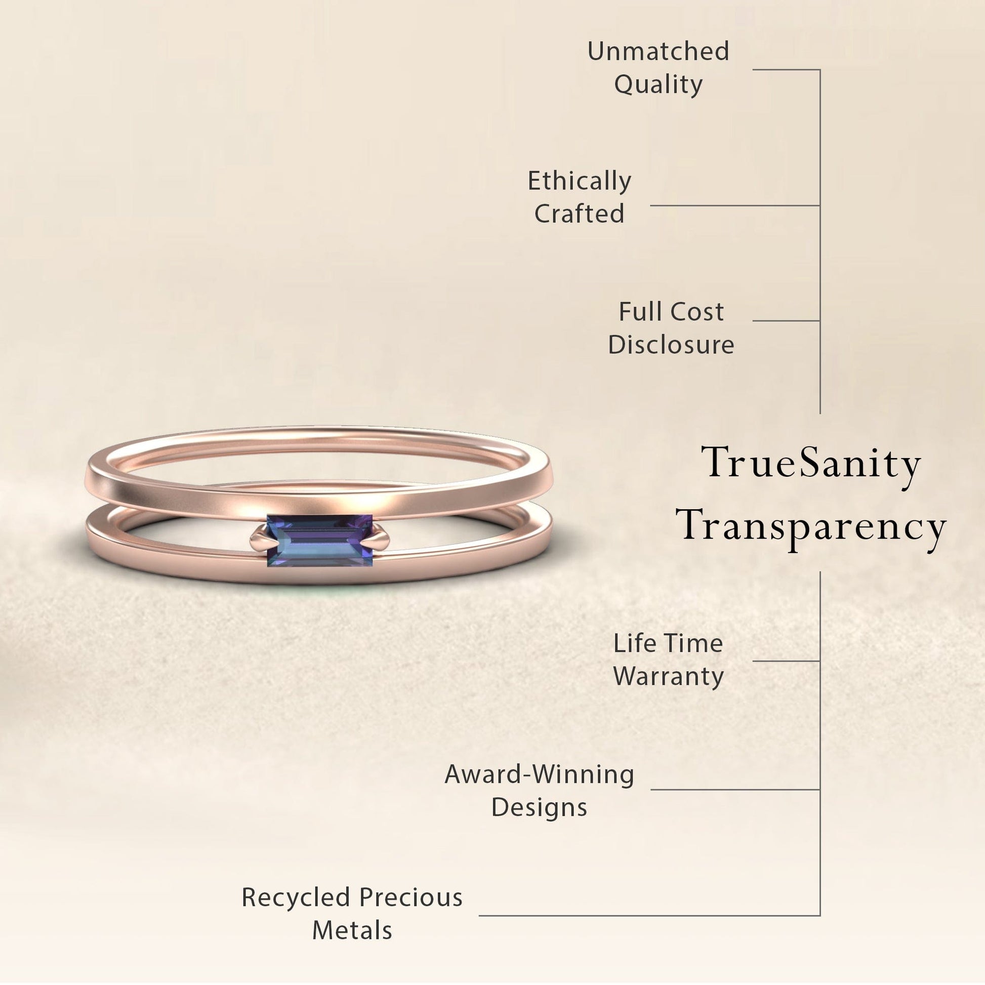 Elevate your style with the Lab Grown Alexandrite Minimalist Double Band Ring - Alia, featuring a mesmerizing baguette-cut Alexandrite that shifts colors under different lighting. Set between two sleek 14K gold bands, this modern and elegant design is available in White, Rose, Yellow, or Blackened Gold, making it a perfect statement piece for any occasion.