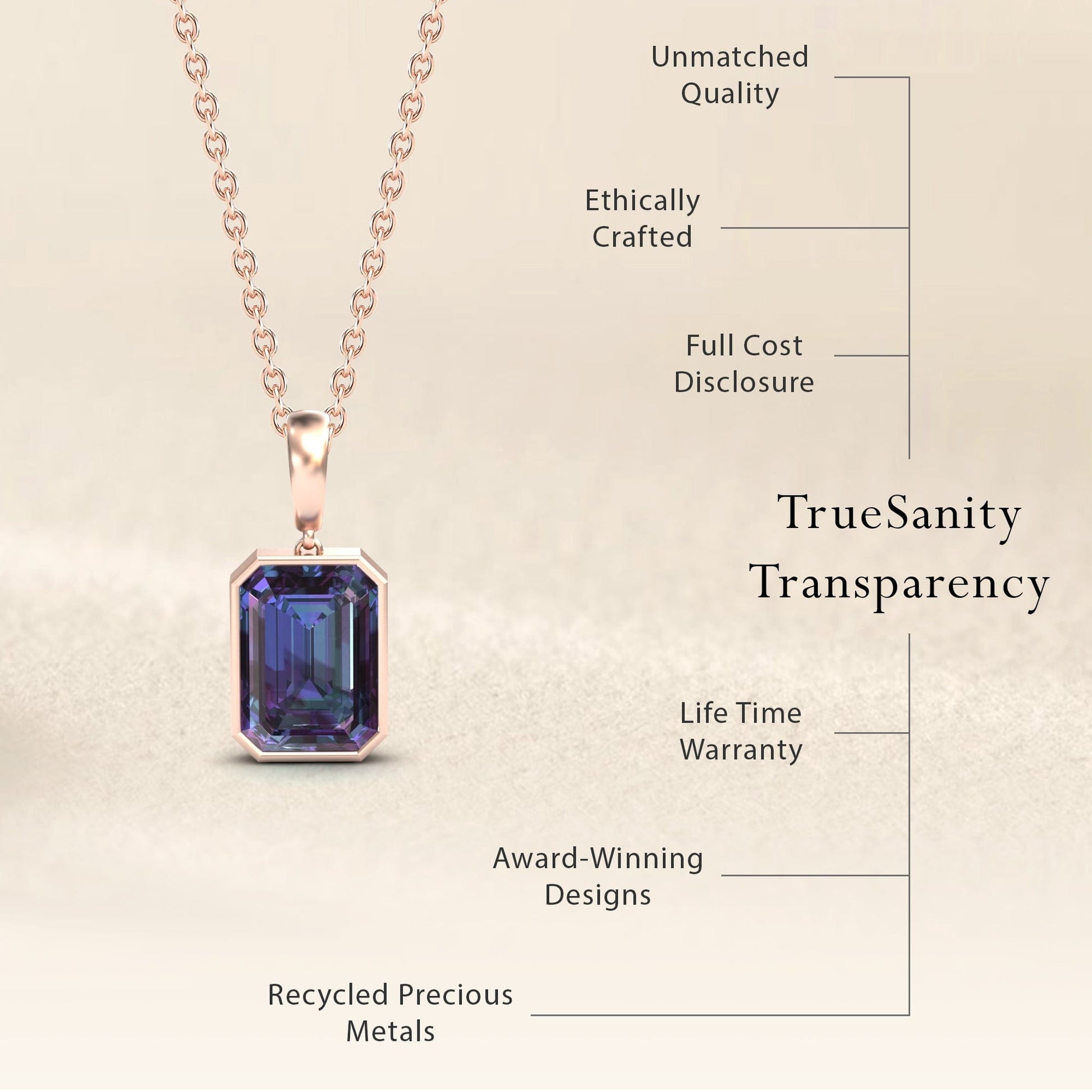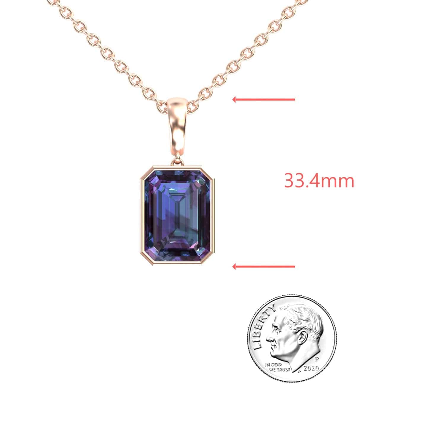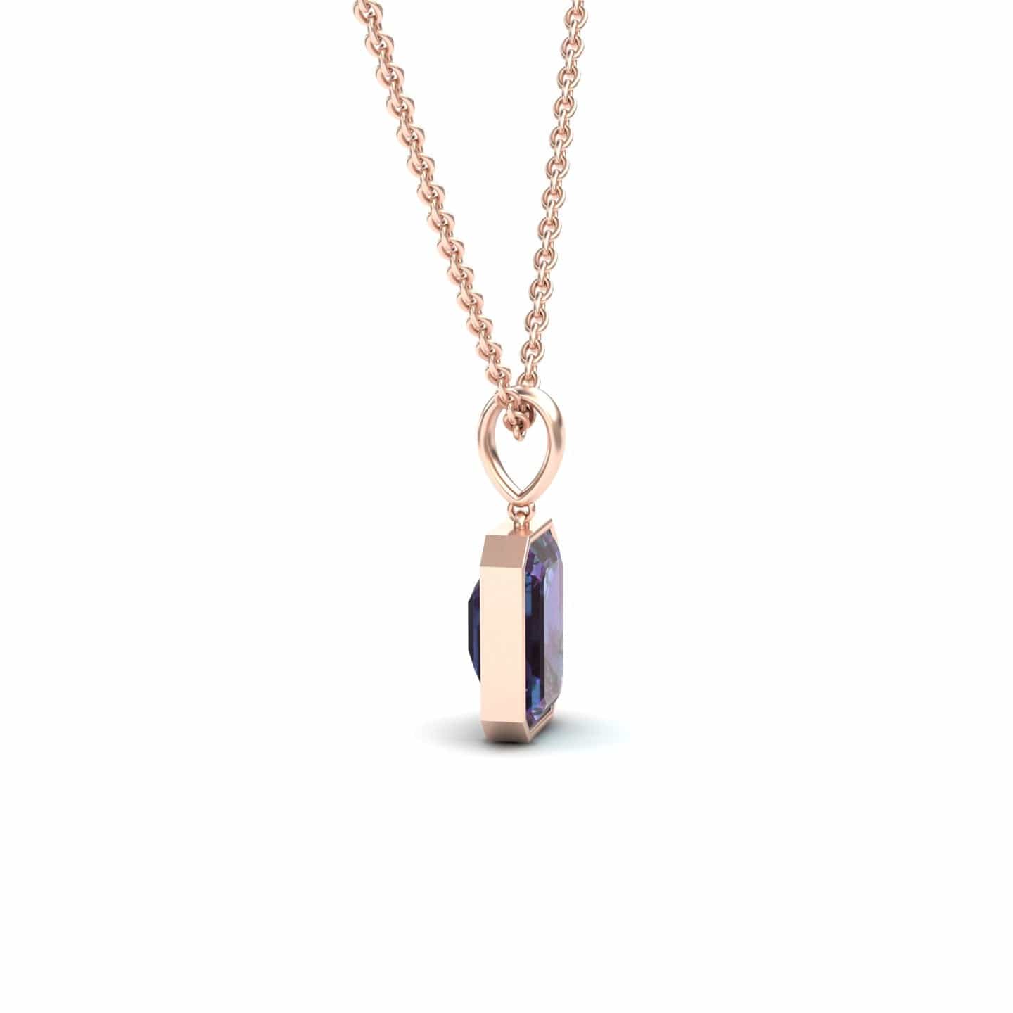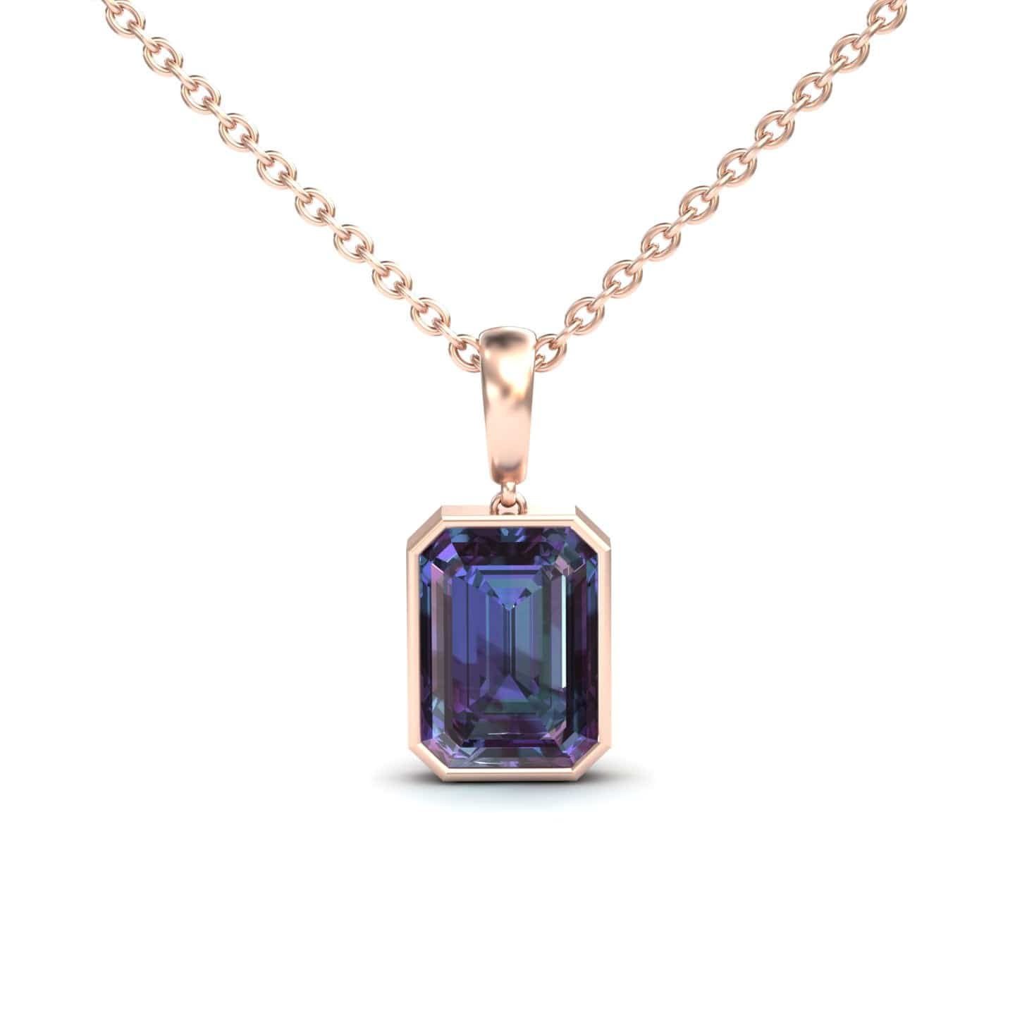 Experience the enchanting color-changing beauty of the Lab Grown Alexandrite Solitaire Pendant - Jovana, featuring an exquisite emerald-cut alexandrite in a sleek bezel setting. Crafted in 14K gold and available in White Gold, Rose Gold, Yellow Gold, and Blackened Gold, this timeless piece effortlessly transitions from day to night with its mesmerizing hues.