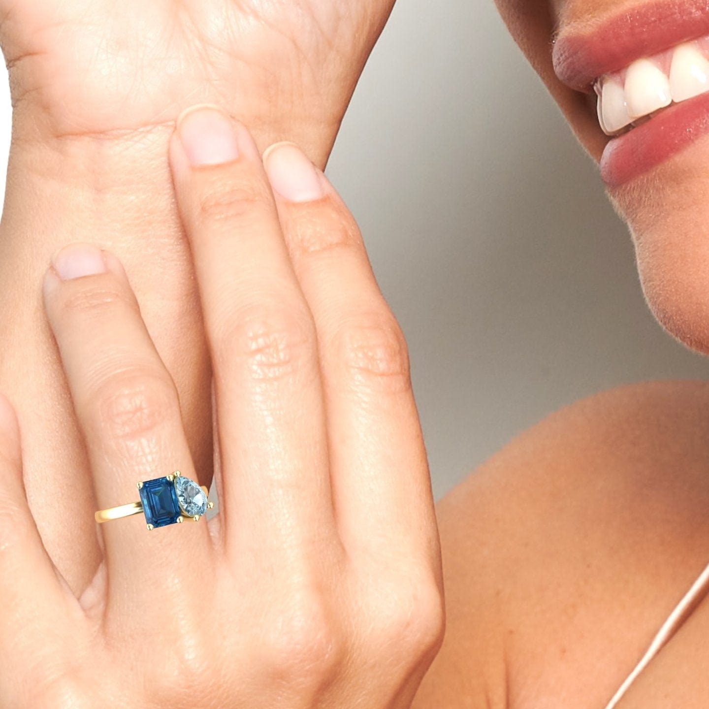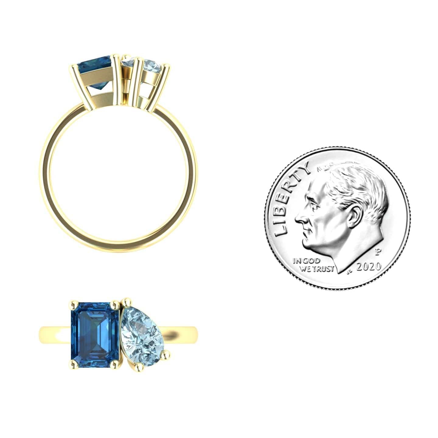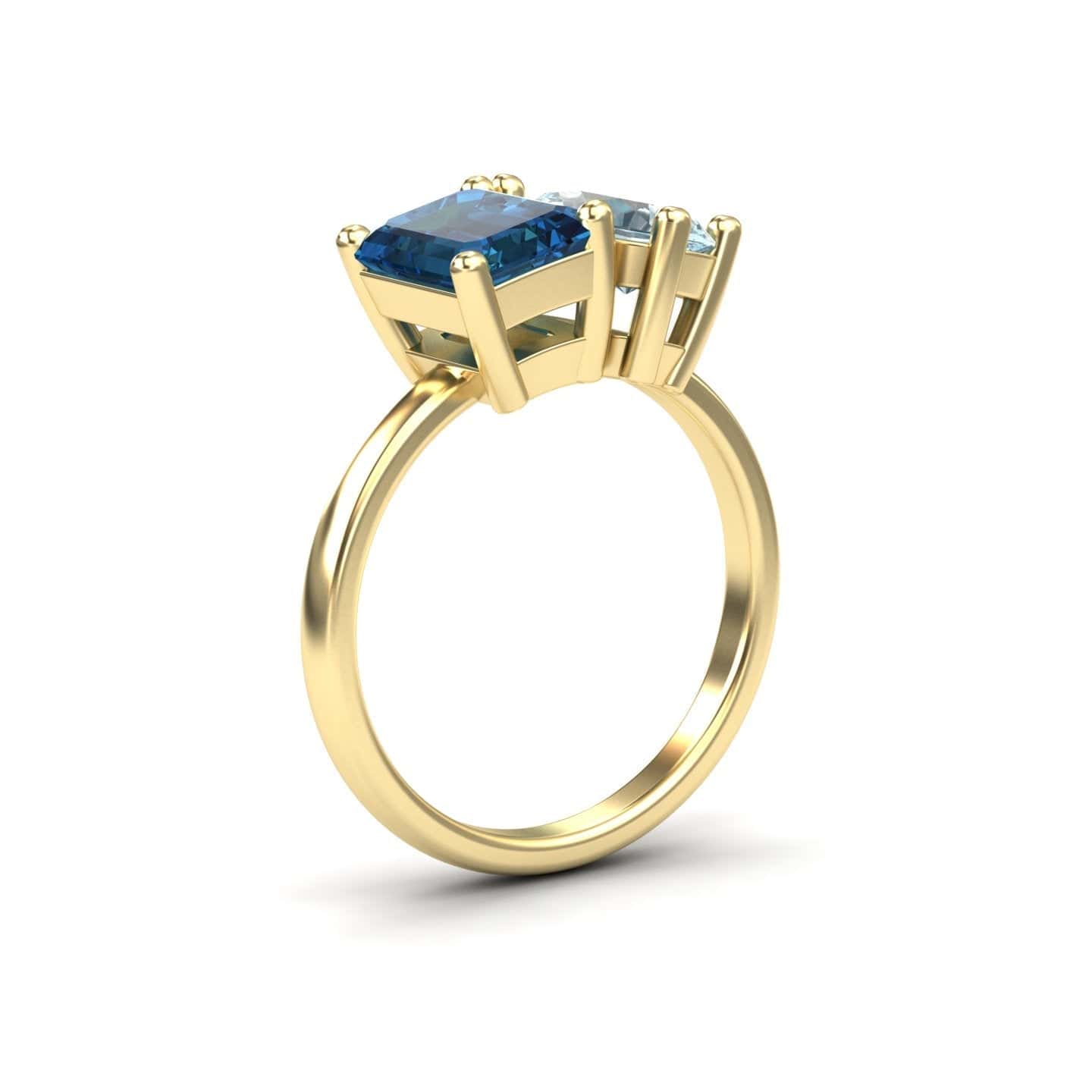 Celebrate duality and elegance with our Ellen Toi et Moi cocktail ring, featuring a bold emerald-cut London Blue Topaz and a shimmering pear-shaped Aquamarine. Set in 14K gold and available in White, Rose, Yellow, and Blackened Gold, this asymmetrical design brings modern romance to your fine jewelry collection.