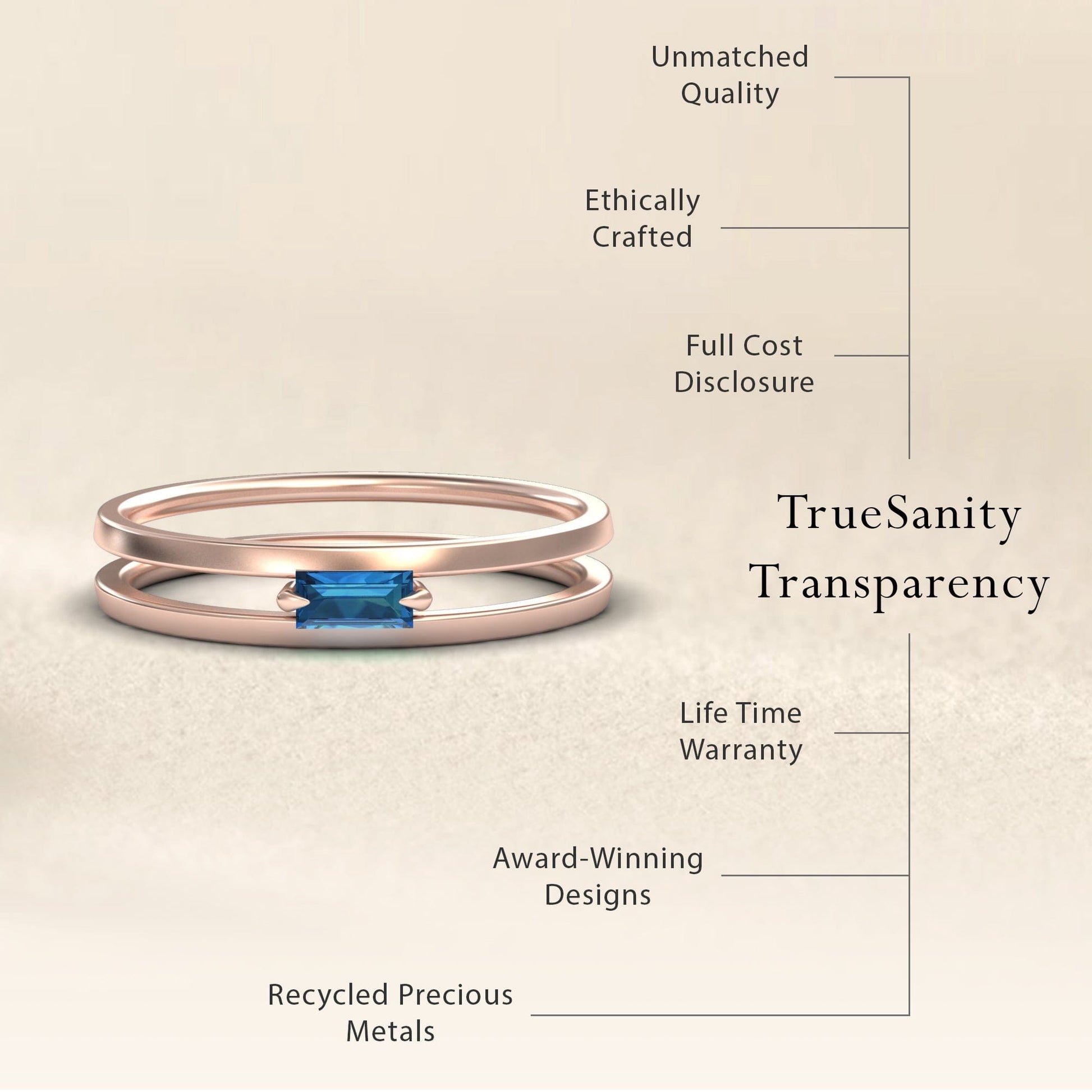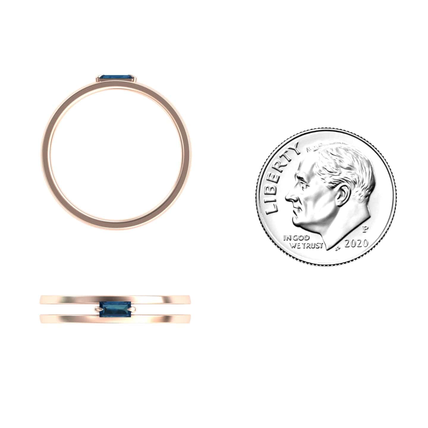 Sophisticated and modern, the London Blue Topaz Minimalist Double Band Ring - Alia features a striking baguette-cut London Blue Topaz, radiating deep oceanic hues. Nestled between two sleek 14K gold bands, this contemporary design is available in White, Rose, Yellow, or Blackened Gold, offering a refined yet bold statement for any occasion.