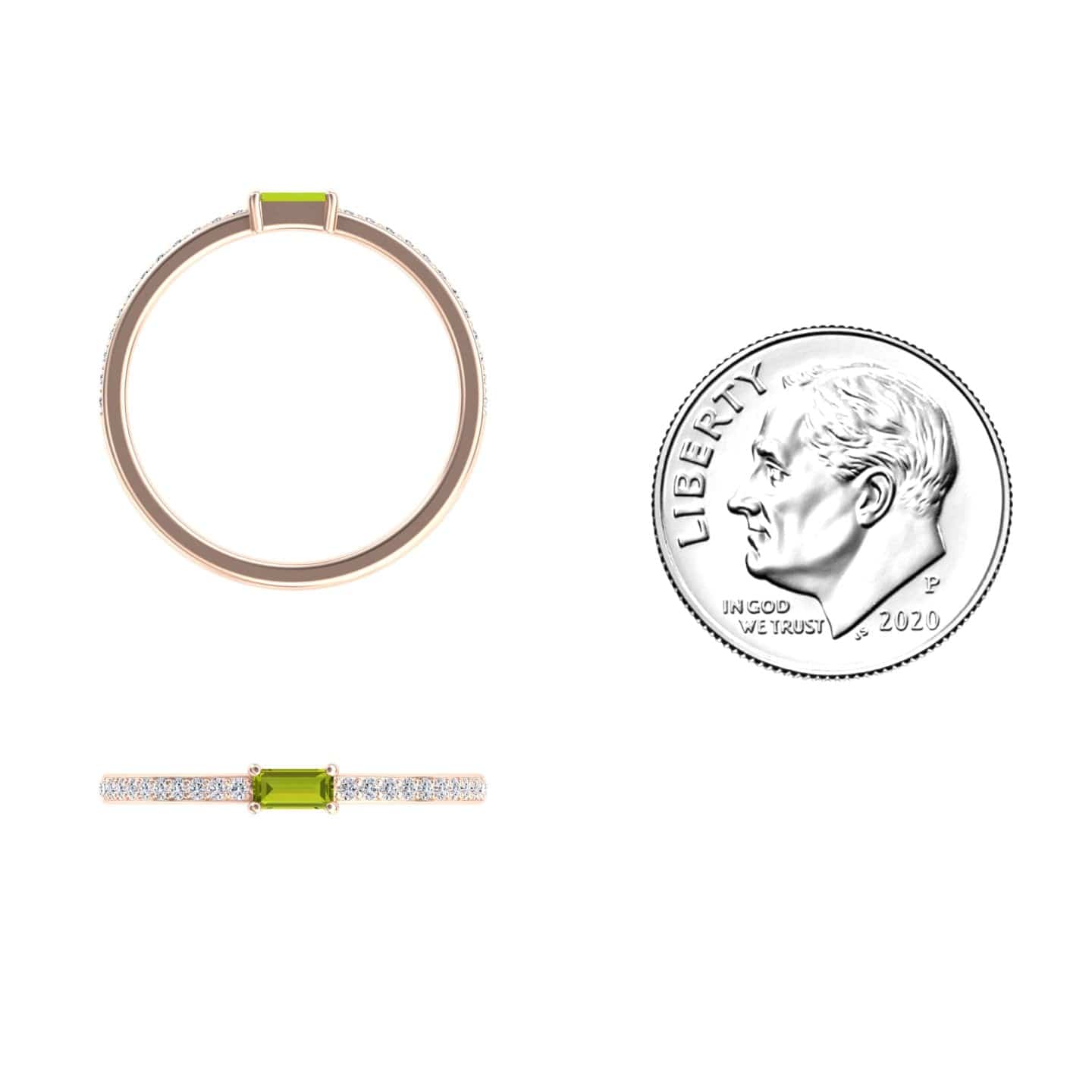 Bright and refreshing, the Peridot & Diamond Pave Ring - Dia features vibrant baguette-cut peridot gemstones accented by dazzling diamonds in a sleek pave setting. Set in 14K gold, this elegant band is perfect for stacking or wearing solo. Available in White Gold, Rose Gold, Yellow Gold, and Blackened Gold.