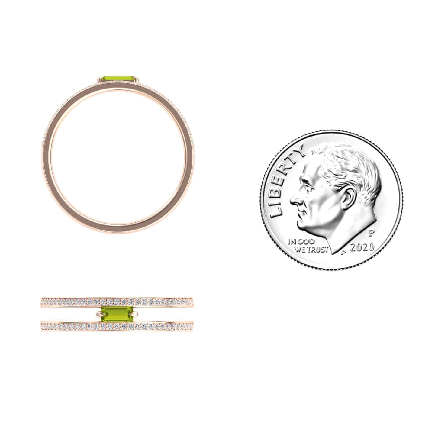Vibrant and captivating, the Peridot & Diamond Double Band - Bianca showcases a striking baguette-cut peridot set between two diamond-accented bands for a perfect balance of elegance and brilliance. The lush green hue of peridot symbolizes renewal and prosperity, making this ring a meaningful and stylish choice. Available in 14K White Gold, Rose Gold, Yellow Gold, and Blackened Gold, it's a stunning piece for any occasion.