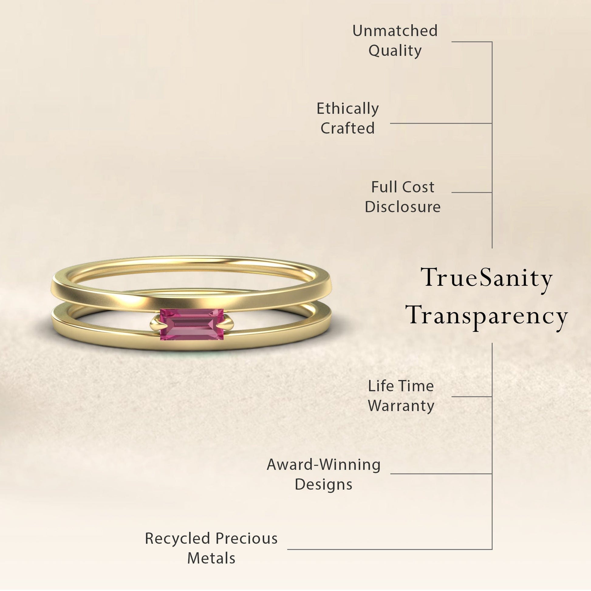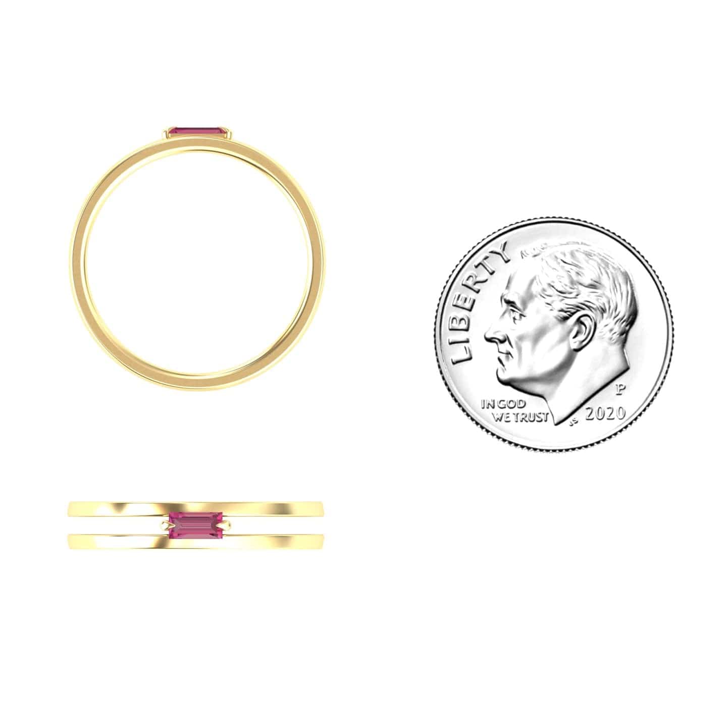 Delicate yet bold, the Pink Tourmaline Minimalist Double Band Ring - Alia features a radiant baguette-cut pink tourmaline nestled between two sleek 14K gold bands. The enchanting pink hue of tourmaline exudes femininity and grace, making this modern design a perfect everyday statement piece. Available in White, Rose, Yellow, or Blackened Gold, this ring offers a contemporary touch of elegance with a pop of color.