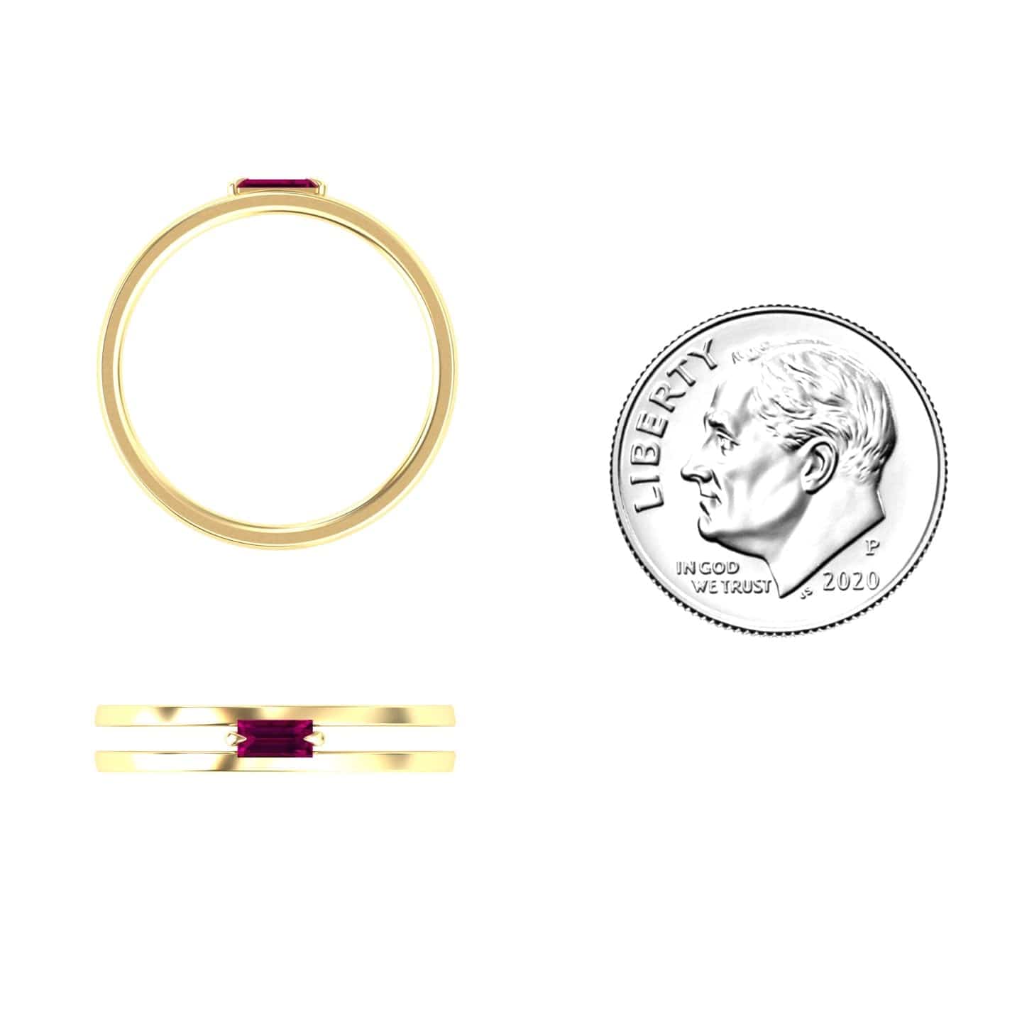 Elevate your style with the Rhodolite Garnet Minimalist Double Band Ring - Alia, featuring a striking baguette-cut rhodolite garnet in a sleek 14K gold setting. The deep raspberry-red hue of rhodolite garnet brings warmth and sophistication to this modern, open-band design. Perfect for stacking or wearing solo, this effortlessly chic ring is available in White, Rose, Yellow, and Blackened Gold, making it a versatile addition to any jewelry collection.