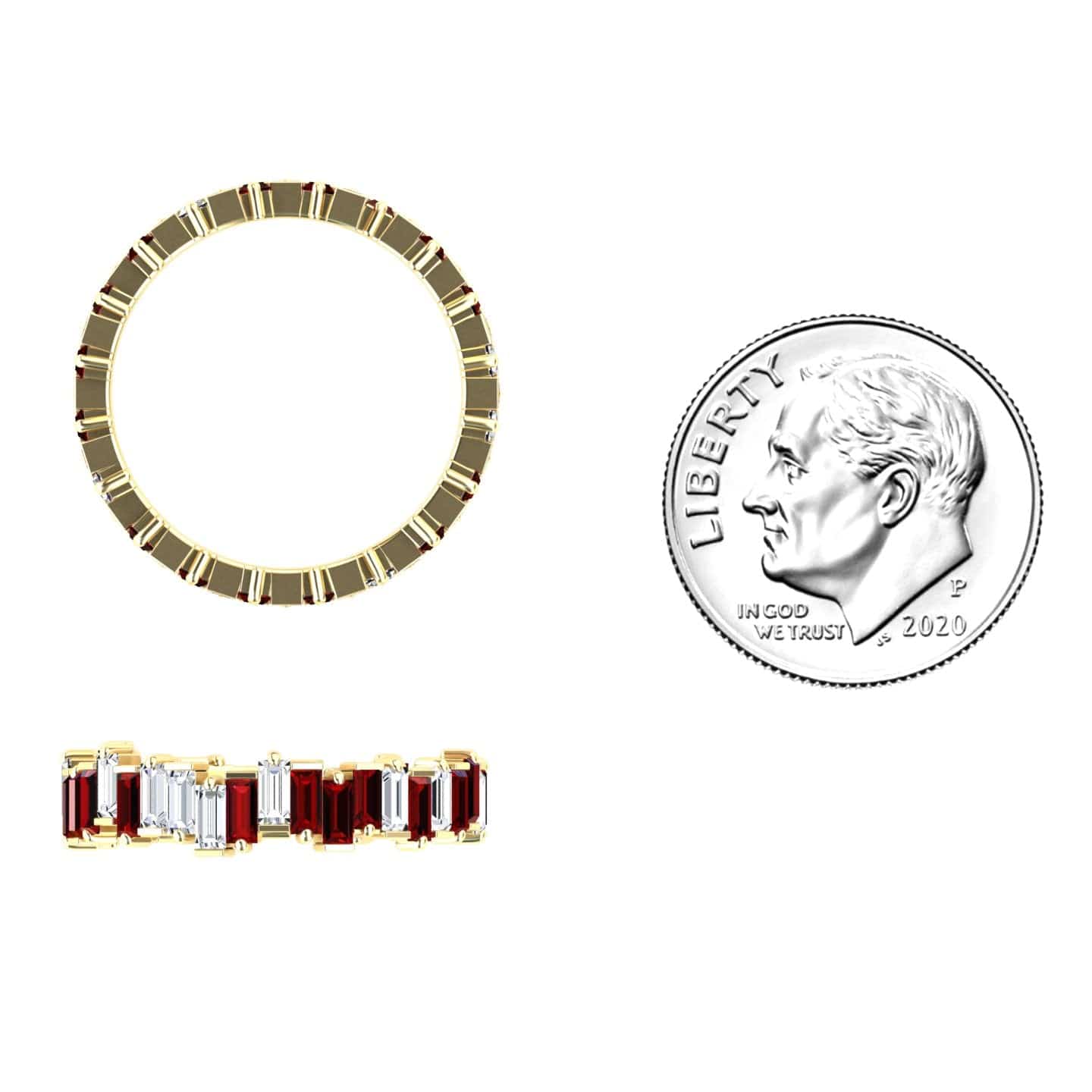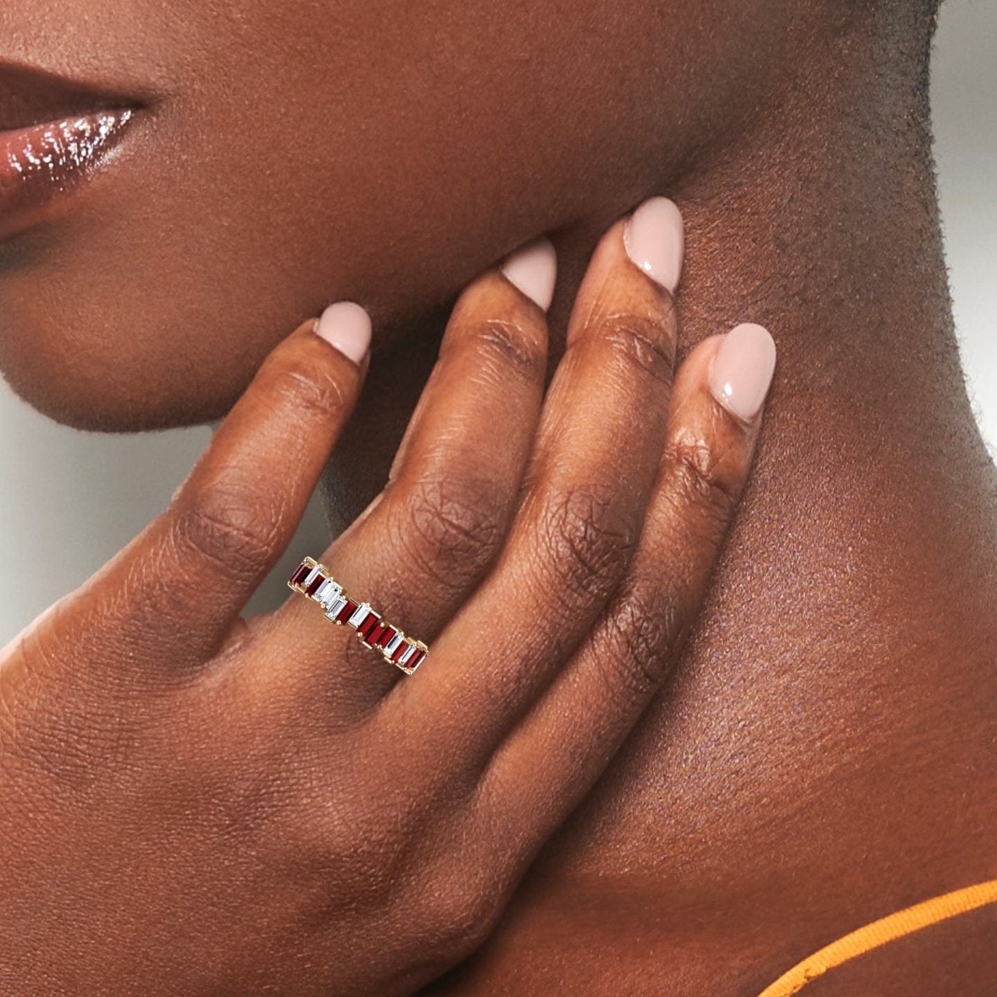 The Ruby & Diamond Classic Eternity Band - Samantha showcases 40 baguette-cut rubies and diamonds in a seamless, elegant design, symbolizing eternal love and timeless beauty. Available in White Gold, Rose Gold, Yellow Gold, and Blackened Gold, this sophisticated eternity band is a perfect choice for weddings, anniversaries, or as a striking stacking ring.