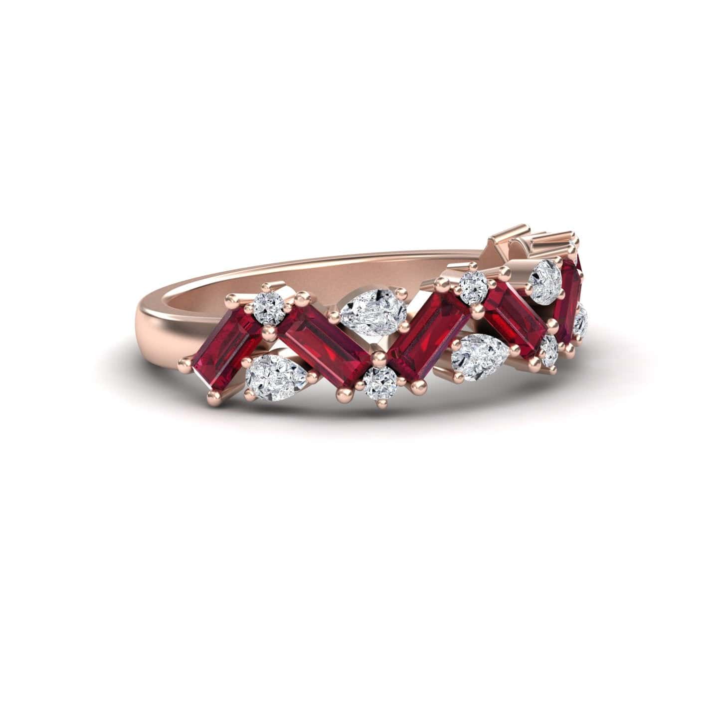 Make a bold statement with the Aimee eternity band, featuring vivid baguette-cut rubies alongside pear and round-cut diamonds in a striking zigzag pattern. Set in your choice of 18K White, Yellow, Rose, Blackened Gold, or Platinum, it’s a radiant blend of passion and timeless sparkle.