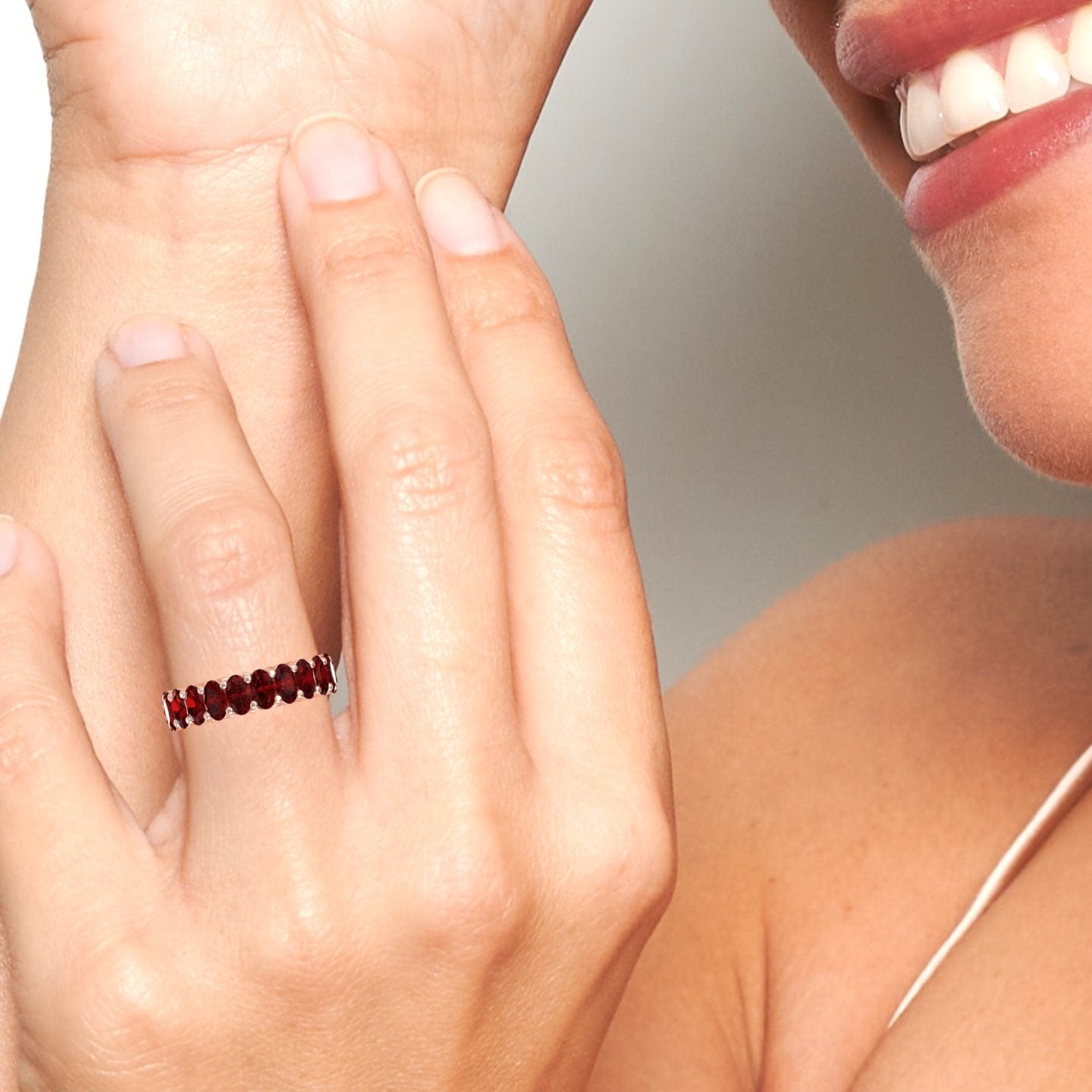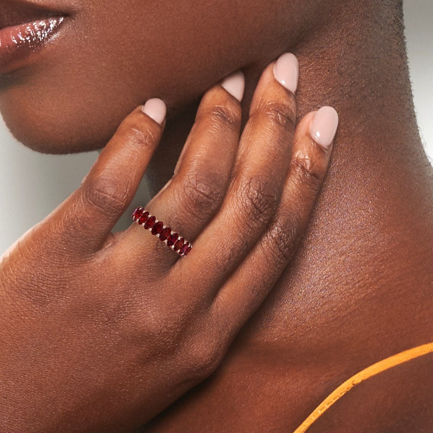 Bold and timeless, the Diana ruby eternity band features 21 stunning oval-cut rubies set in a continuous circle of 14K gold. Available in White Gold, Rose Gold, Yellow Gold, and Blackened Gold, this ring adds rich, romantic color to any jewelry collection.