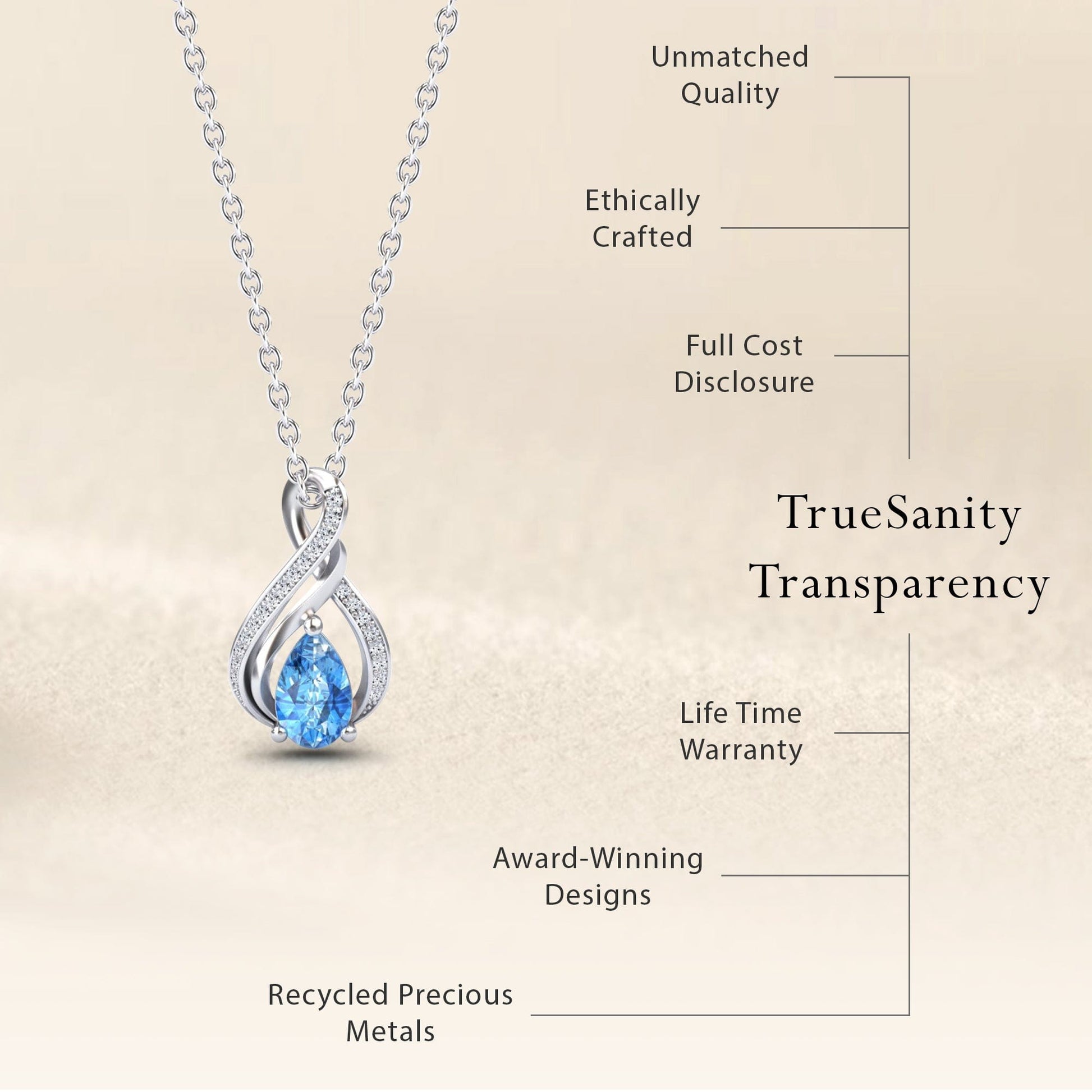 The Swiss Blue Topaz & Diamond Infinity Twist Necklace - Maddison showcases a mesmerizing pear-shaped Swiss Blue Topaz, radiating serenity and brilliance. Embraced by a graceful diamond-accented infinity twist, this piece symbolizes eternal elegance. Available in White Gold, Rose Gold, Yellow Gold, and Blackened Gold, it's a stunning addition to any jewelry collection.