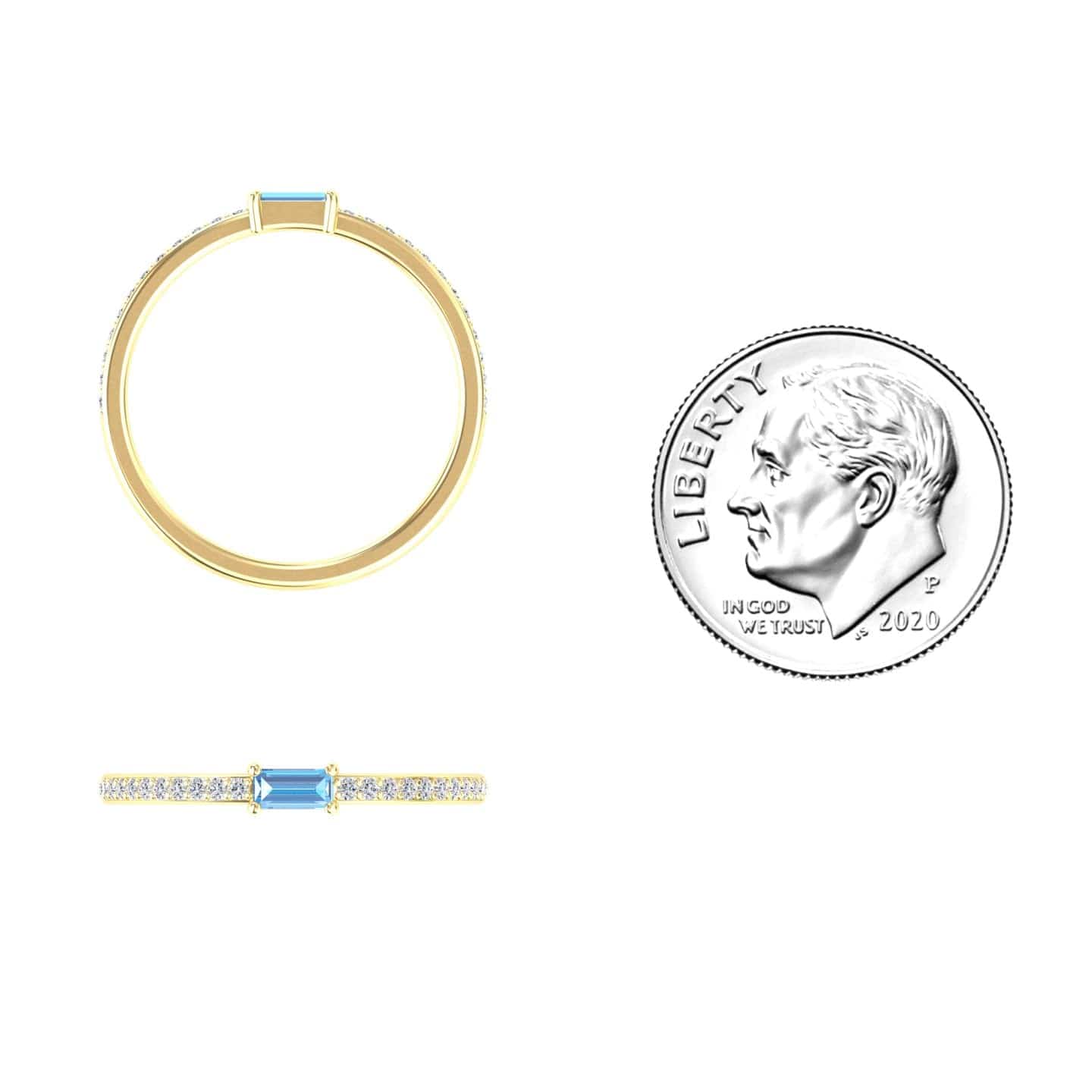 Make a bold statement with our Swiss Blue Topaz & Diamond Pave Ring - Dia, featuring a dazzling baguette-cut Swiss blue topaz complemented by shimmering diamond pave. Set in 14K gold, this vibrant stacking ring adds a touch of brilliance to any look. Available in White Gold, Rose Gold, Yellow Gold, and Blackened Gold.