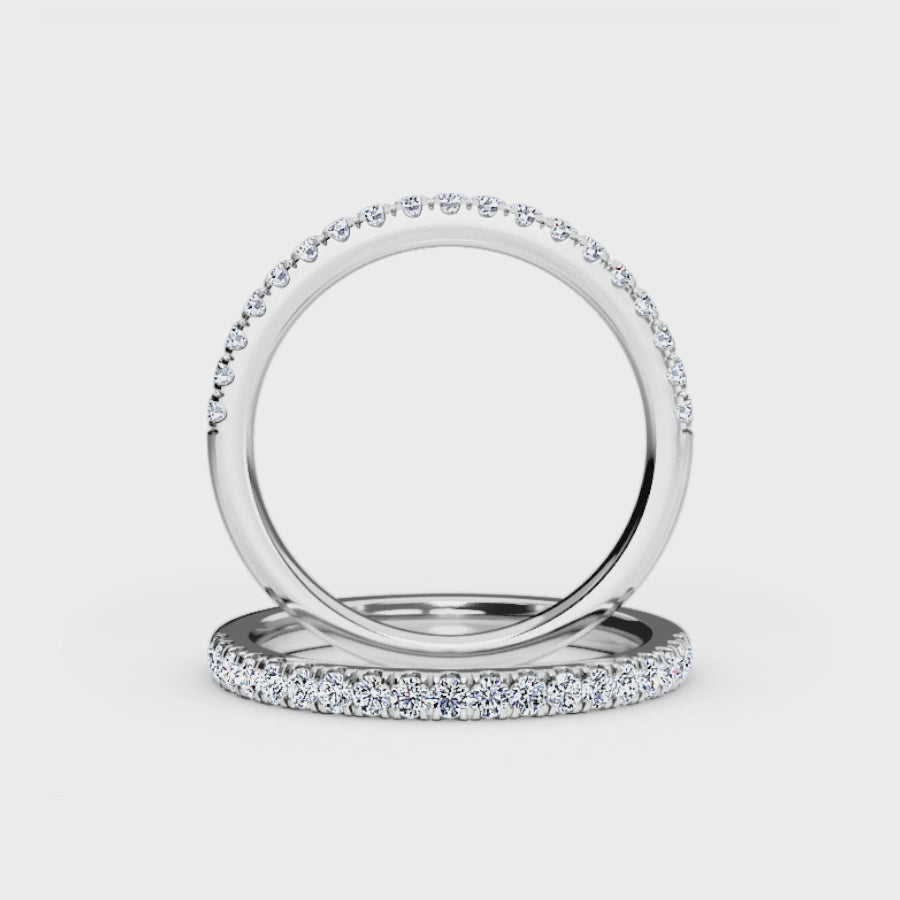 The Michaela bridal ring set offers a modern and elegant look, featuring a white diamond bezel-set halo engagement ring with sparkling round side stones and a perfectly matching wedding band. Crafted in your choice of luxurious 18k white gold, rose gold, yellow gold, blackened gold, or platinum, this set provides a secure and radiant symbol of your enduring love.
