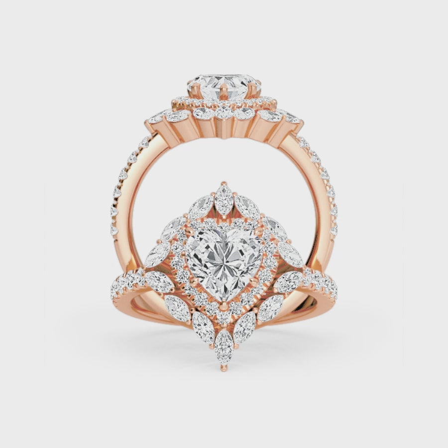 The Evelina engagement ring features a captivating celestial bloom halo of white diamonds surrounding the center stone, further accented by elegant marquise and brilliant round side diamonds. Crafted in your choice of five exquisite 18k gold options – white gold, romantic rose gold, traditional yellow gold, modern blackened gold, or luxurious platinum – this ring offers a unique and radiant expression of your love.