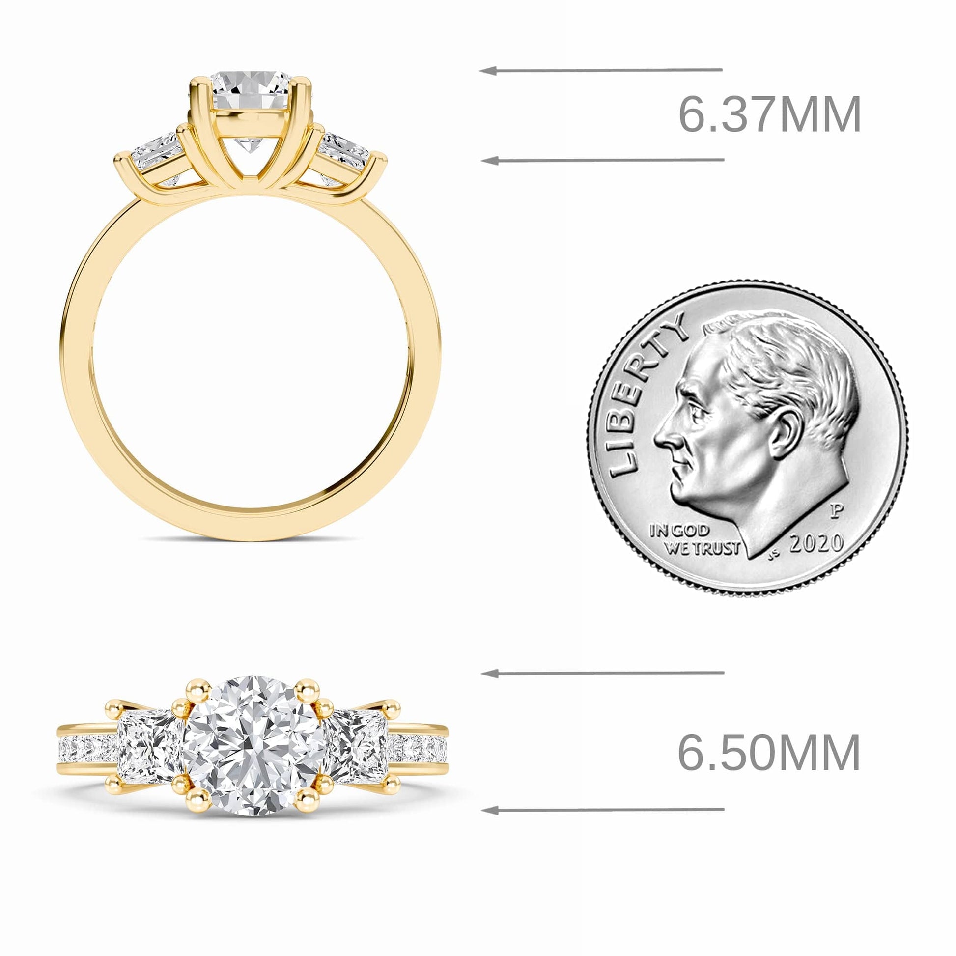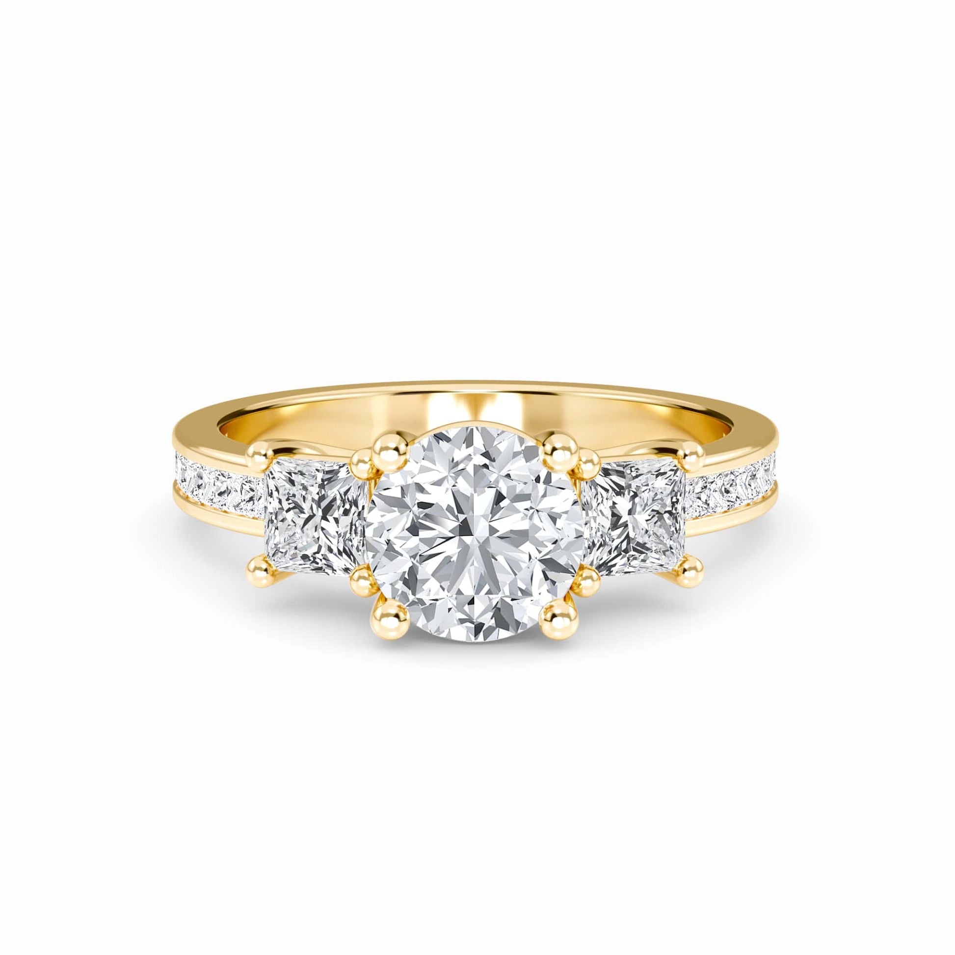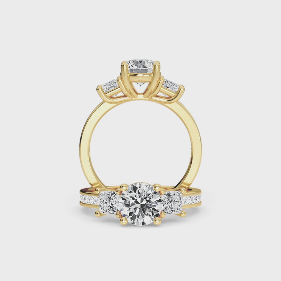 The Rowan Engagement Ring showcases timeless elegance with a trio of sparkling white diamonds, flanked by princess-cut side stones and set in a sleek channel setting. Crafted for modern romance, it’s available in 18K White Gold, Rose Gold, Yellow Gold, Blackened Gold, and Platinum—perfect for a proposal that stands out.