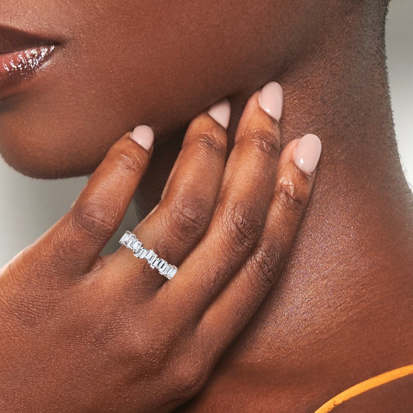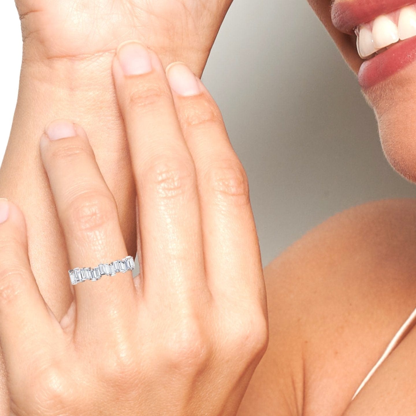 The White Diamond Classic Eternity Band - Samantha is a timeless masterpiece, featuring 40 stunning baguette-cut white diamonds for a seamless sparkle. Perfect as a wedding band, anniversary gift, or stacking ring, this elegant piece is available in White Gold, Rose Gold, Yellow Gold, and Blackened Gold, offering versatility and brilliance for any occasion.