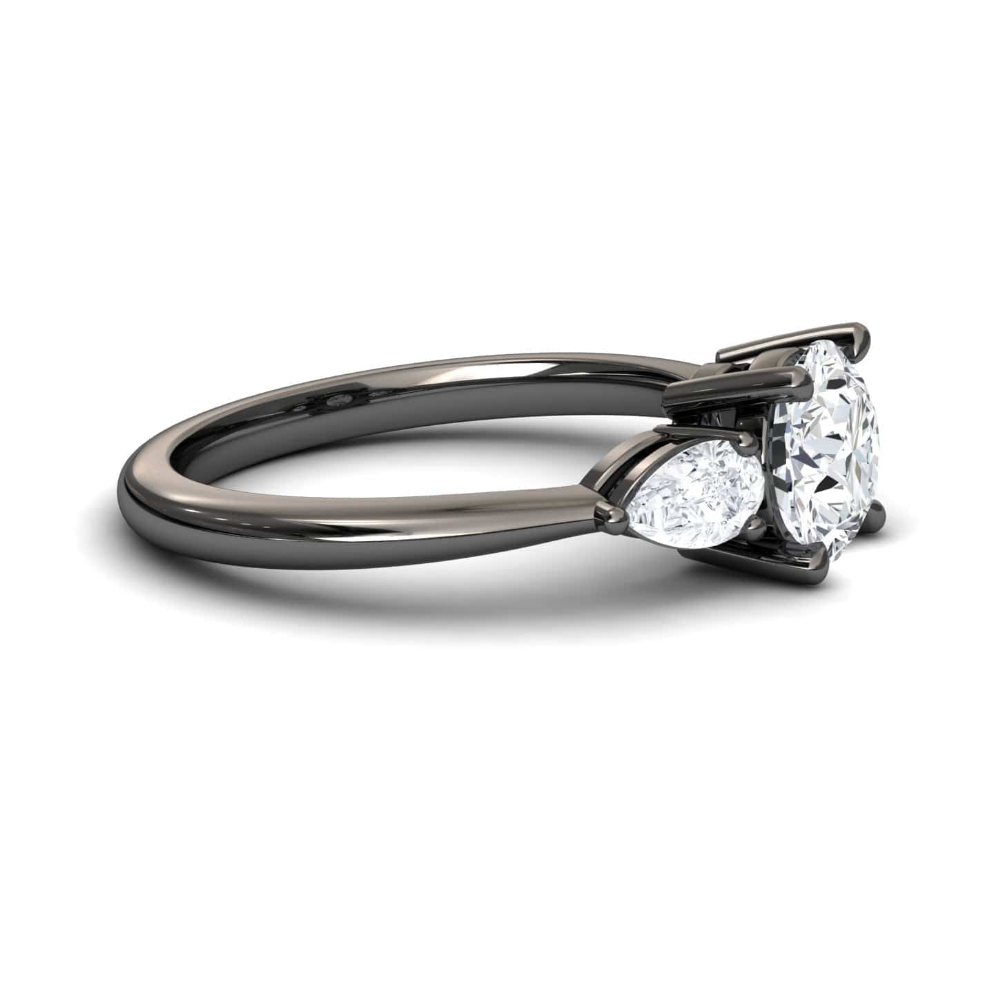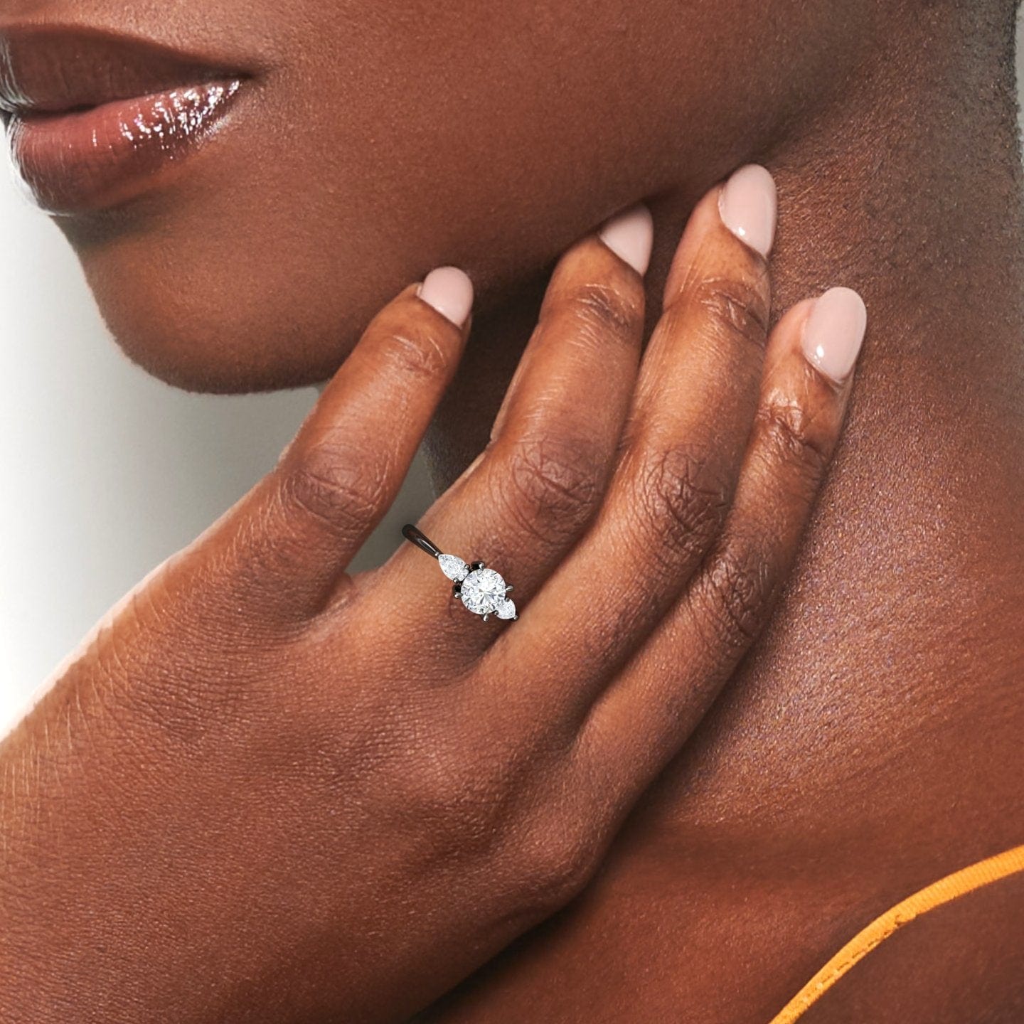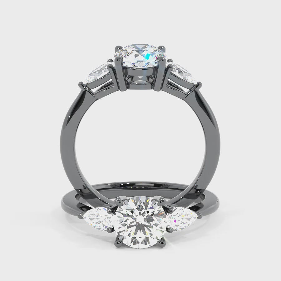 Discover the enduring beauty of the Juniper white diamond three-stone engagement ring. The pear-cut side stones add a unique touch to the classic design, perfectly complementing the center diamond. Personalize this sophisticated ring in your preferred 18k gold: classic white gold, romantic rose gold, warm yellow gold, contemporary blackened gold, or precious platinum.