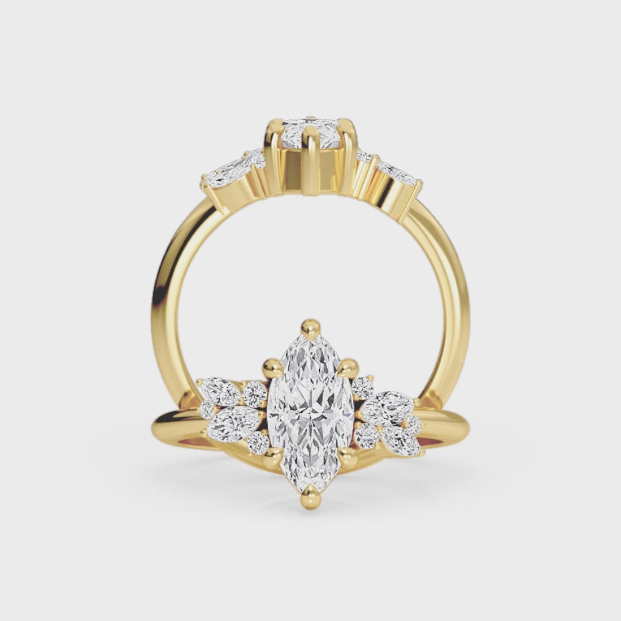 The Isolde engagement ring features a dazzling cluster of white diamonds, including elegant marquise and brilliant round cuts, creating a breathtaking and unique sparkle. Crafted in your choice of five exquisite 18k gold options – white gold, romantic rose gold, traditional yellow gold, modern blackened gold, or luxurious platinum – this ring offers a captivating and modern expression of your love.