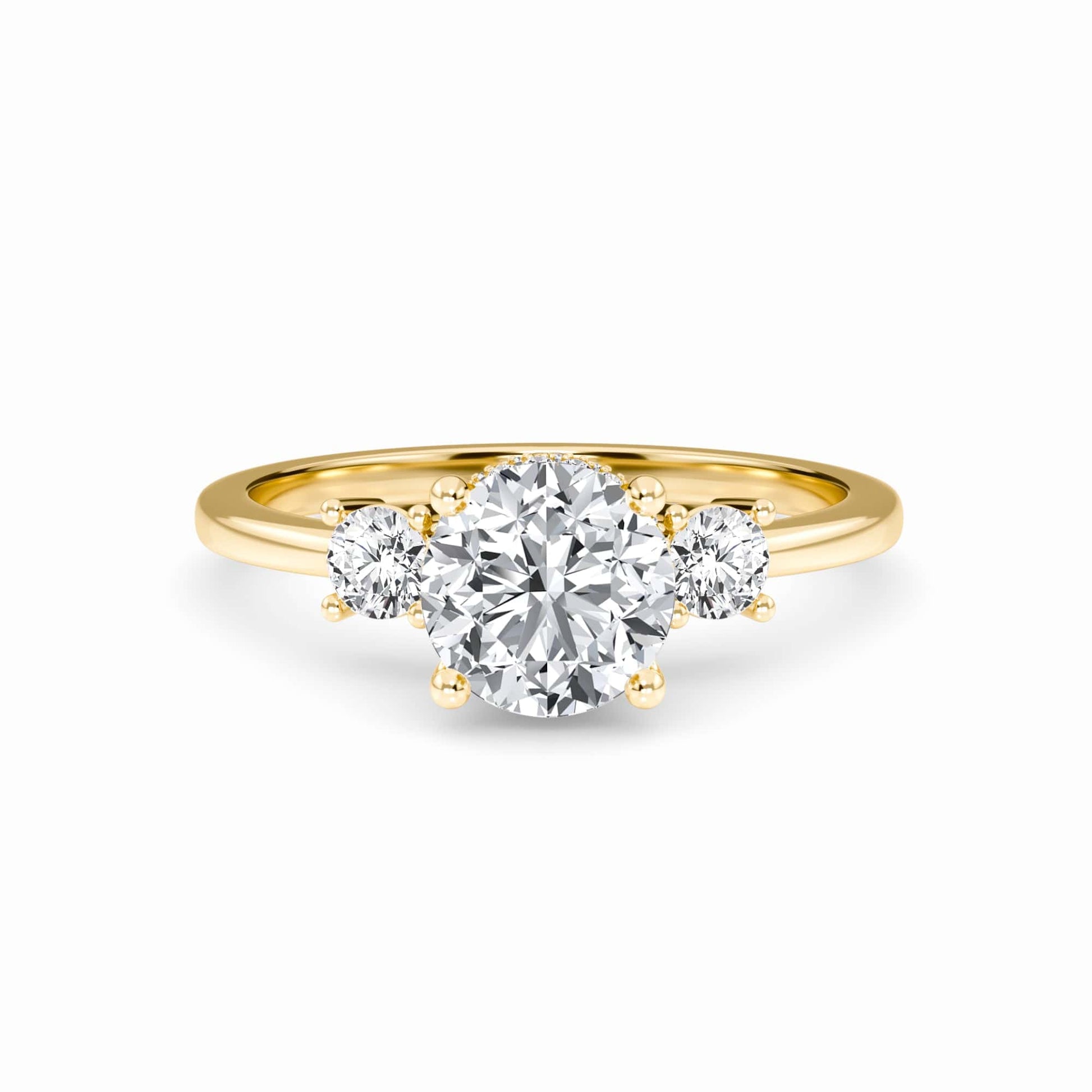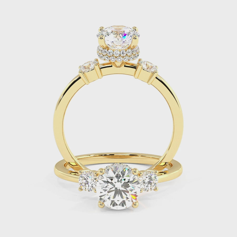 Rachel White Diamond Floral Hidden Halo Three Stone Bridal Engagement Ring