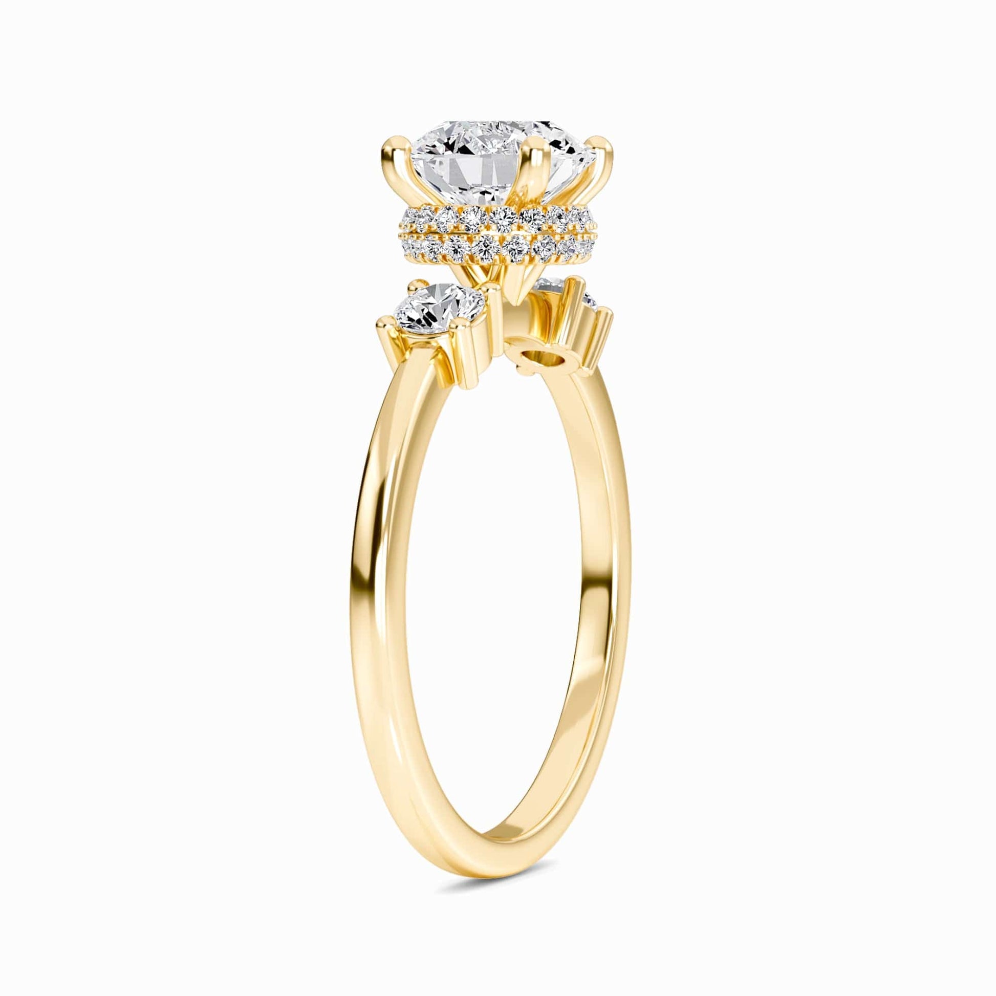 White Diamond Floral Hidden Halo Three Stone Bridal Engagement Ring - Rachel