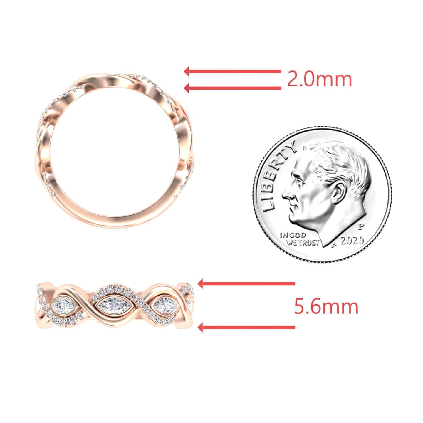 The White Diamond Infinity Twist Band - Selma is a timeless symbol of elegance and eternity, featuring five marquise-cut diamonds seamlessly intertwined with round brilliant diamonds in a delicate infinity twist design. Crafted for versatility, this dazzling band is available in White Gold, Rose Gold, Yellow Gold, and Blackened Gold, making it the perfect stacking or statement ring.