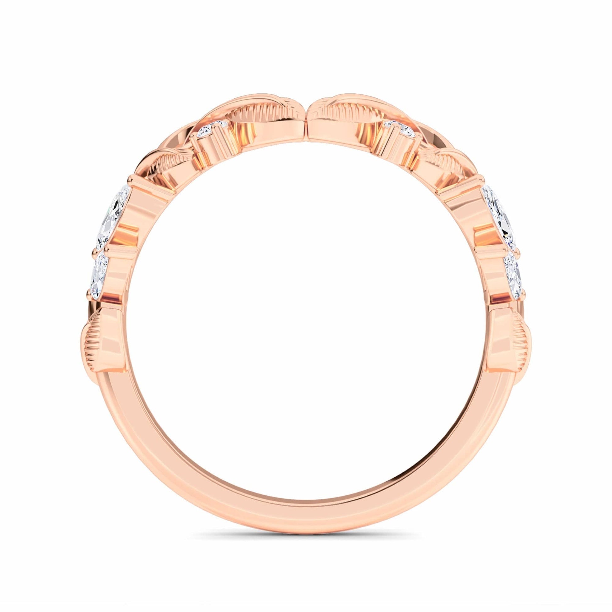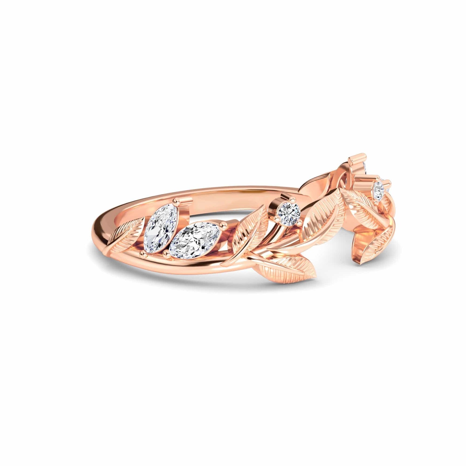 Inspired by nature’s elegance, the White Diamond Leaf Motif Band Ring – Ritu features a graceful arrangement of round and marquise-cut diamonds nestled in sculpted gold leaves. Available in 18K white, rose, yellow, blackened gold, and platinum, this poetic design makes a romantic statement as a wedding band or everyday luxury.