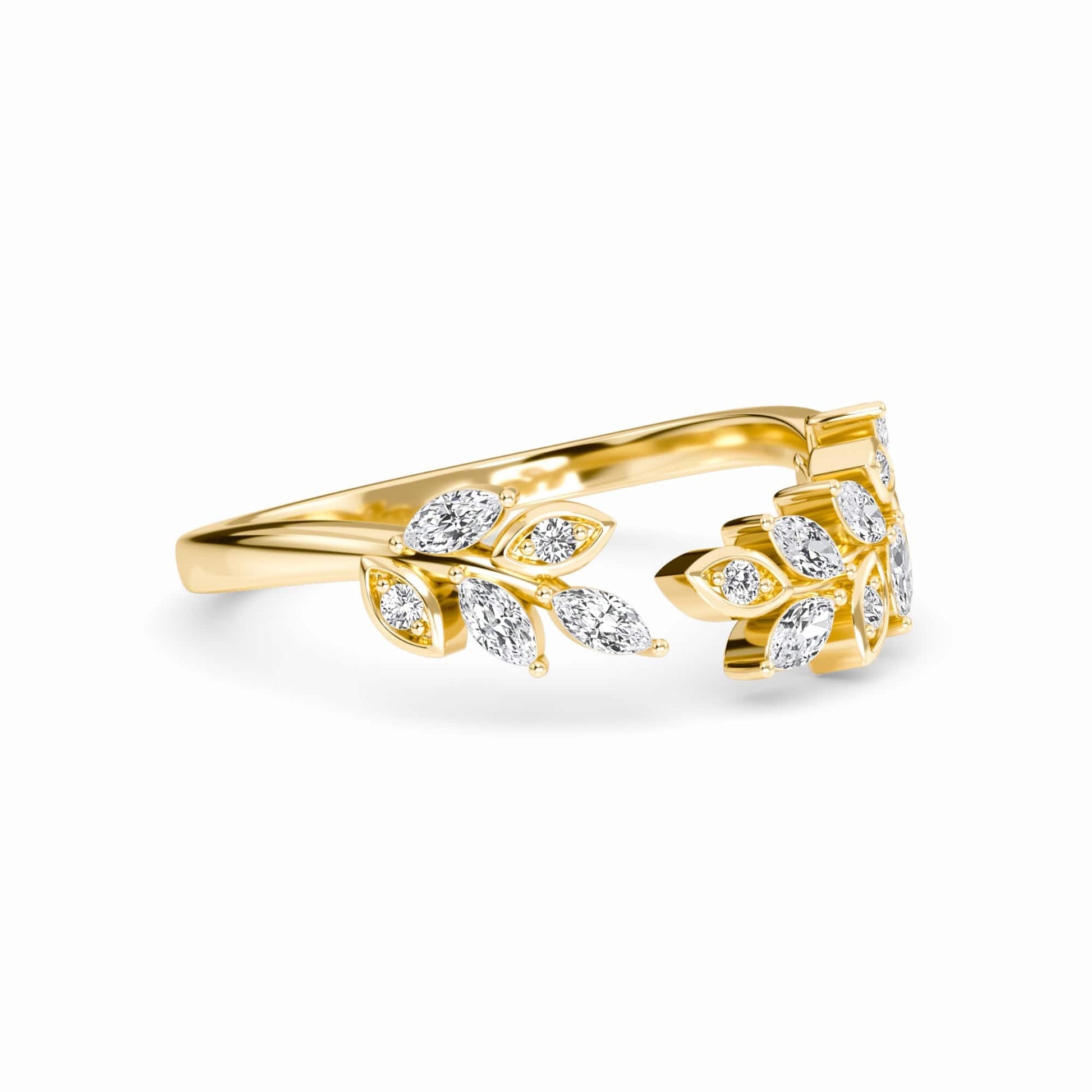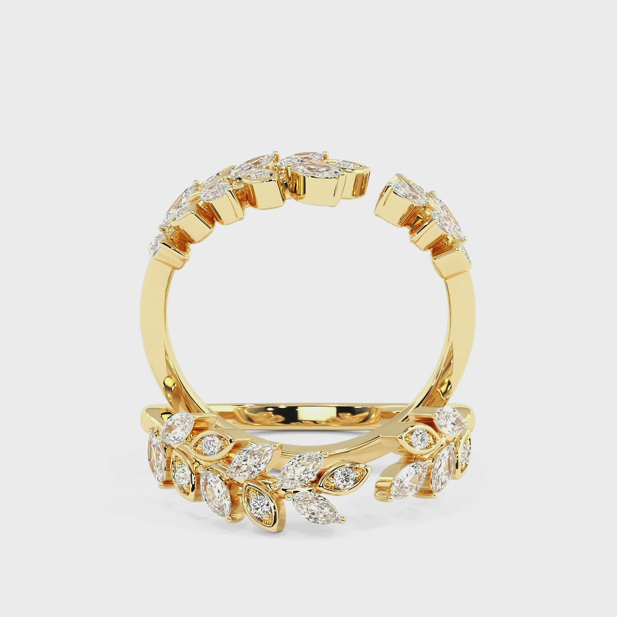 The Lingxia band features a delicate leaf-inspired open design adorned with sparkling marquise and round white diamonds. Crafted in your choice of five exquisite 18k gold options – white gold, rose gold, yellow gold, blackened gold, and platinum – this band offers a uniquely elegant touch inspired by nature.