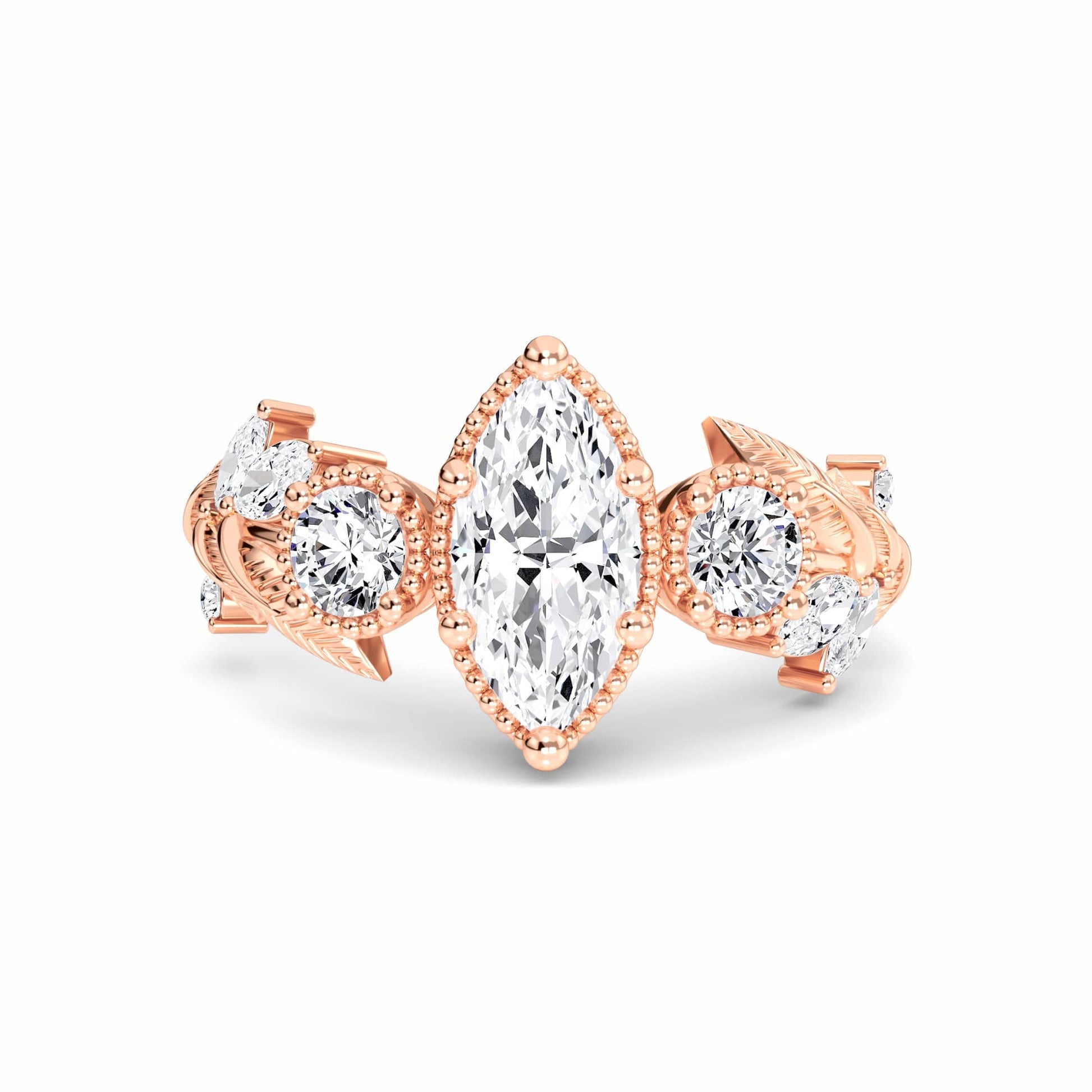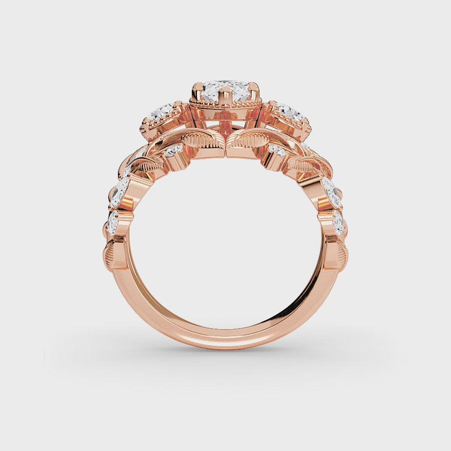The Yanxia bridal ring set offers a unique celestial touch, featuring a white diamond three-stone engagement ring with intricate leaf and scroll detailing and sparkling round and marquise side stones, accompanied by a perfectly matching wedding band. Crafted in your choice of luxurious 18k white gold, rose gold, yellow gold, blackened gold, or platinum, this set offers a beautiful symbol of your growing love.