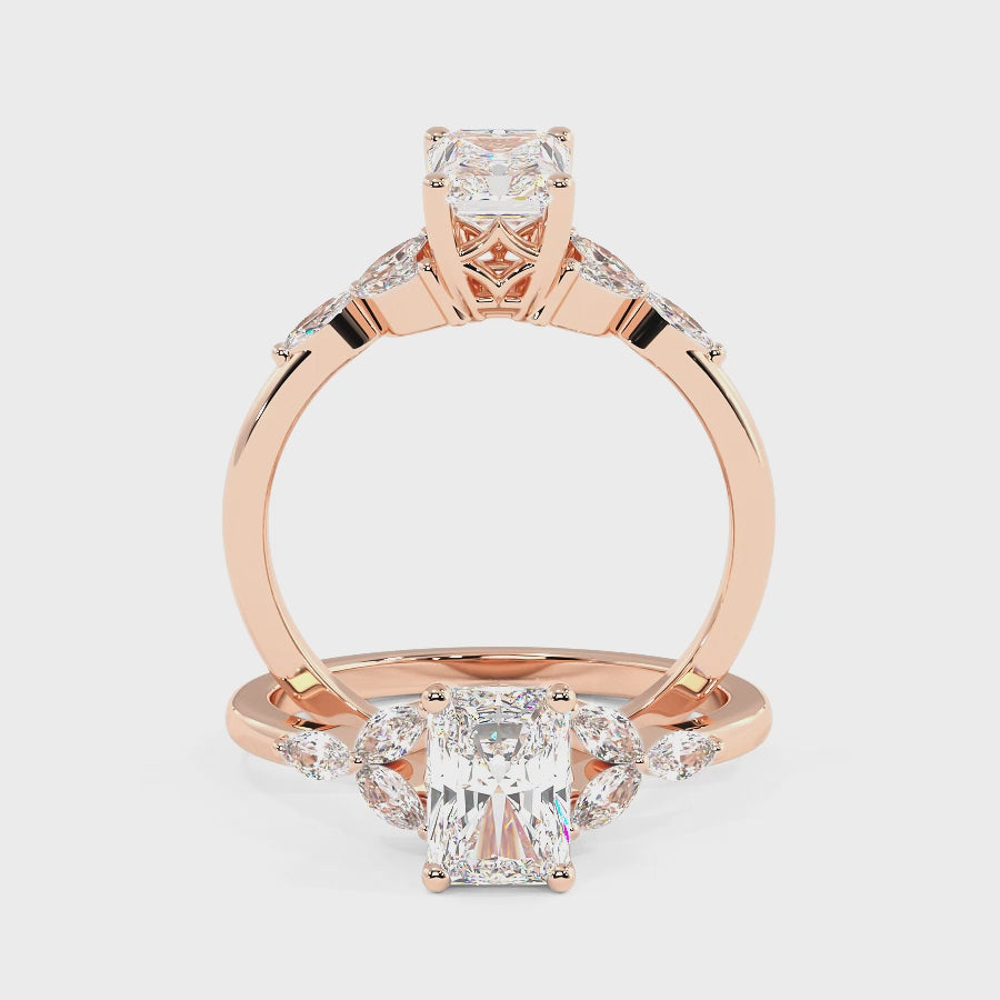 This stunning White Diamond Engagement Ring features a nature-inspired design, with delicate Marquise accents enhancing its beauty. Available in five luxurious 18k gold colors—White, Rose, Yellow, Blackened, and Platinum—this timeless piece symbolizes everlasting love and elegance. Perfect for those seeking a unique and custom engagement ring to mark their special moment.