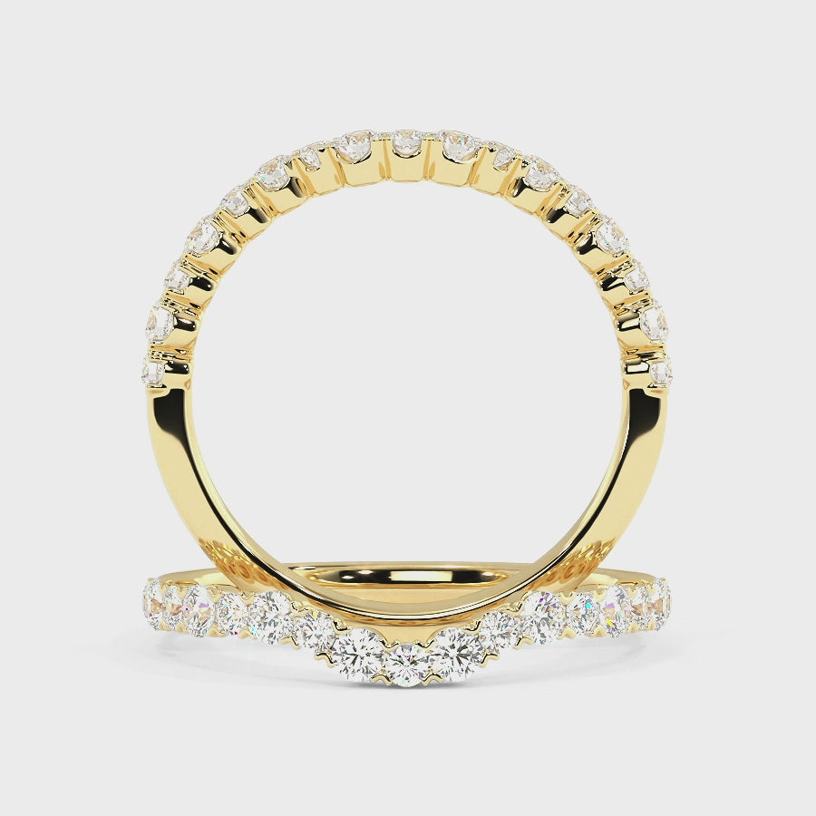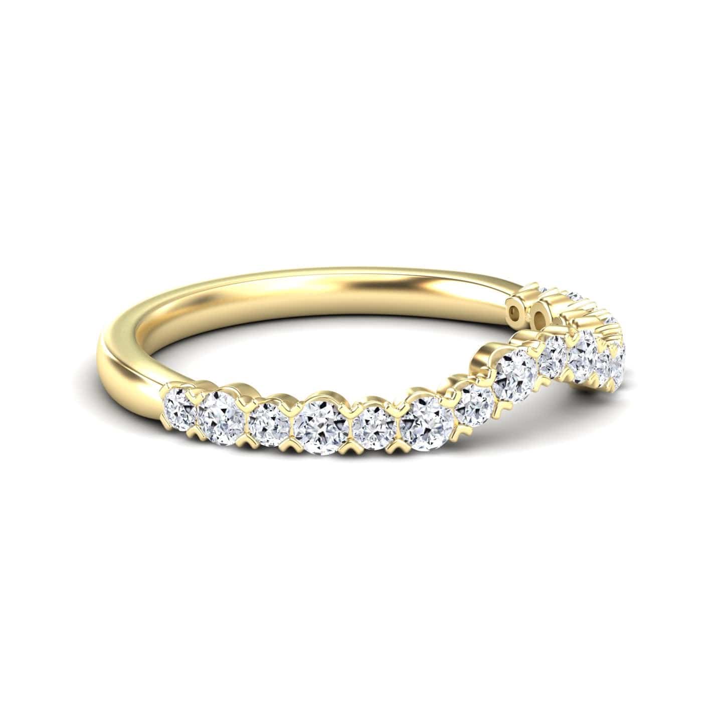The White Diamond Stackable Curved Wedding Ring – Shaina features 17 brilliant round diamonds in a graceful curve, designed to nest beautifully with your engagement ring or stack on its own. Available in 18K white, rose, yellow, blackened gold, and platinum, it blends elegance with everyday wearability.
