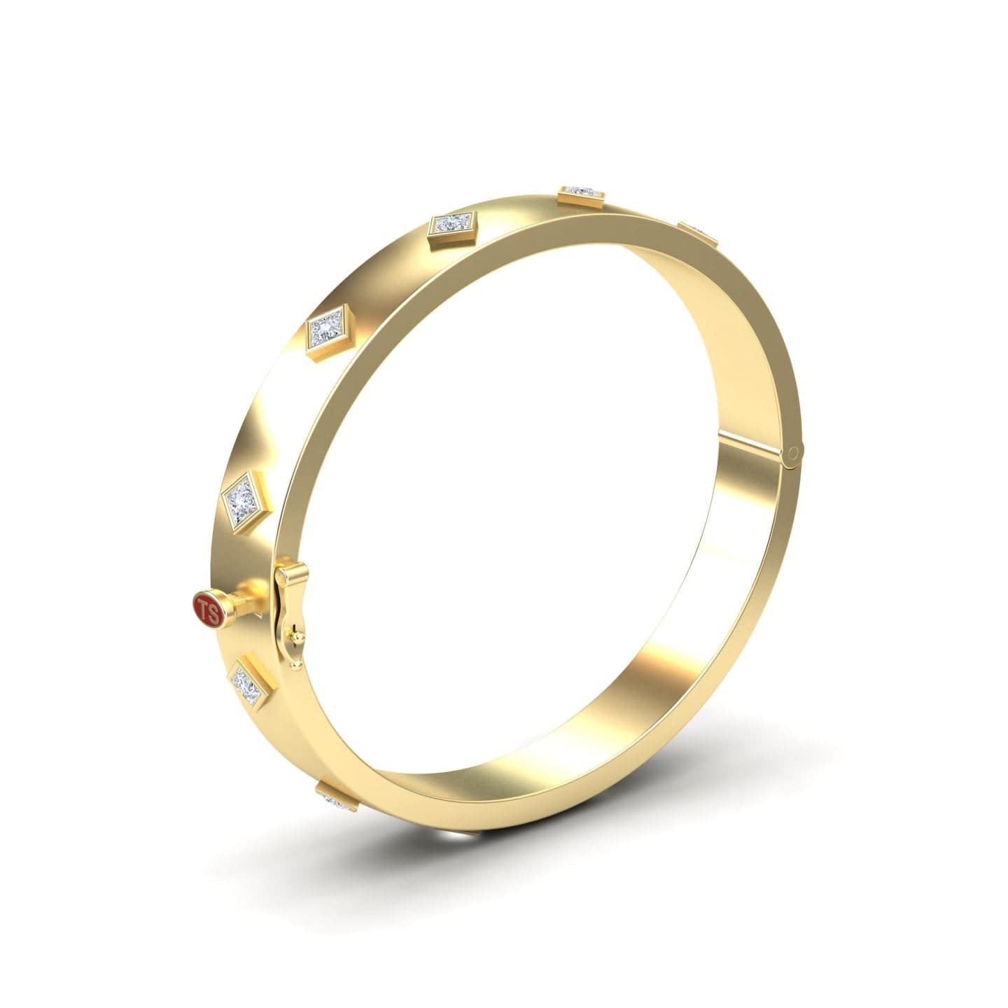 Elevate your style with the White Diamond Studded Geometric Bangle Bracelet - Beatrix, featuring 12 princess-cut white diamonds set in a sleek, contemporary design. Crafted in 14K gold, this luxurious bangle is available in White Gold, Rose Gold, Yellow Gold, and Blackened Gold, making it the perfect statement piece for any occasion.