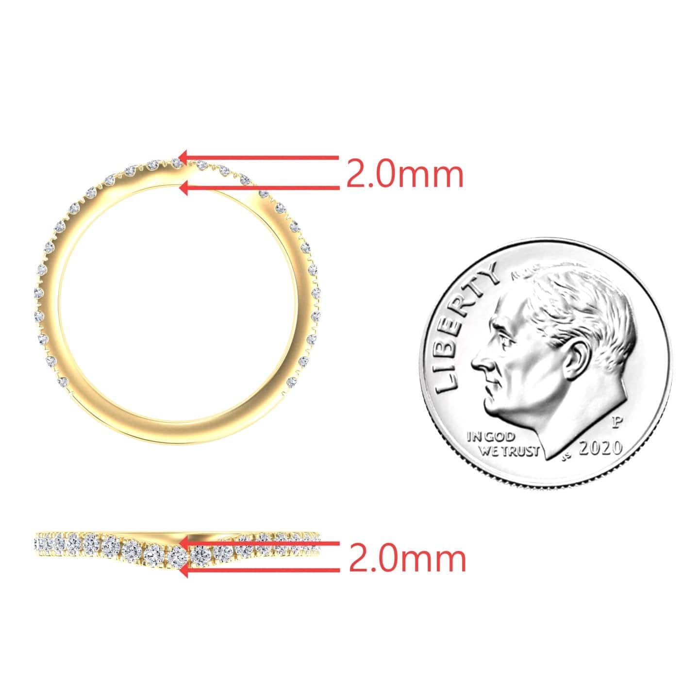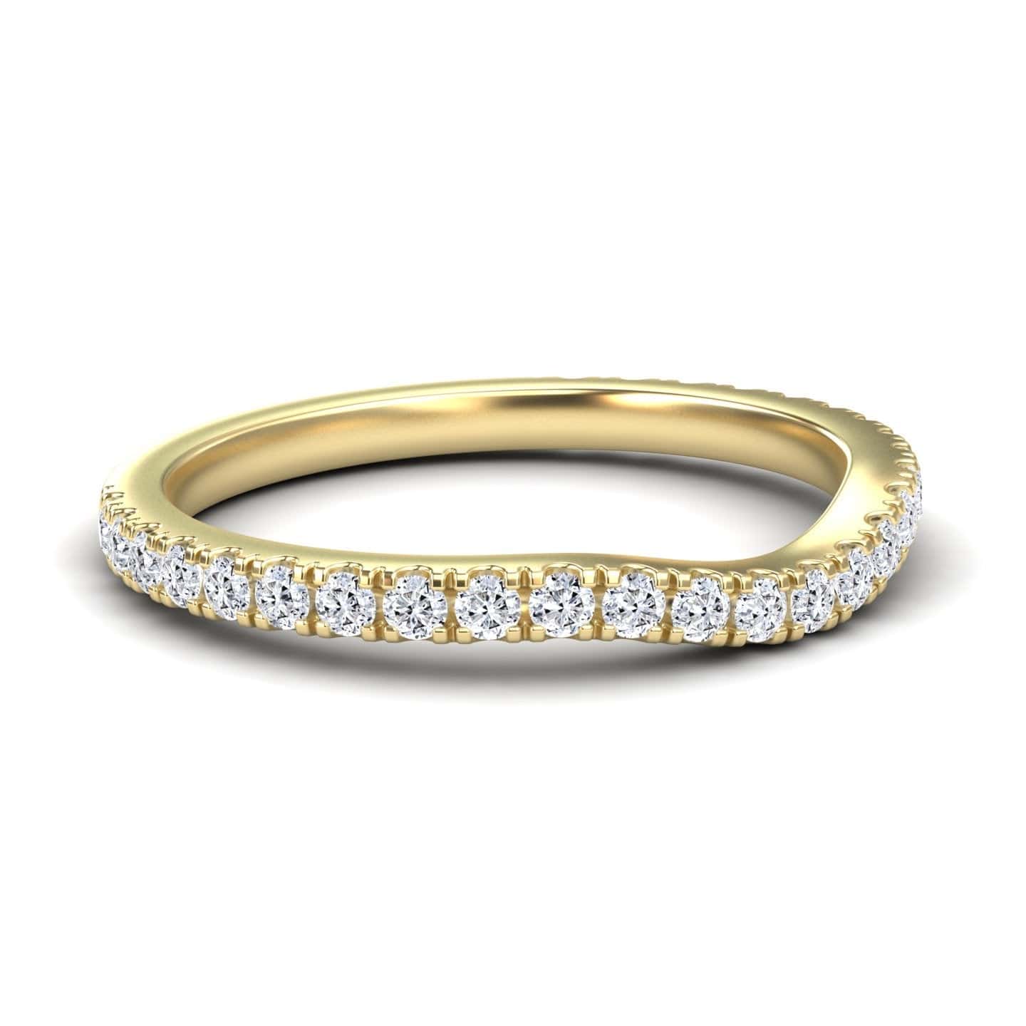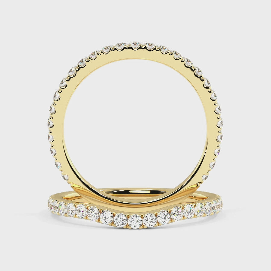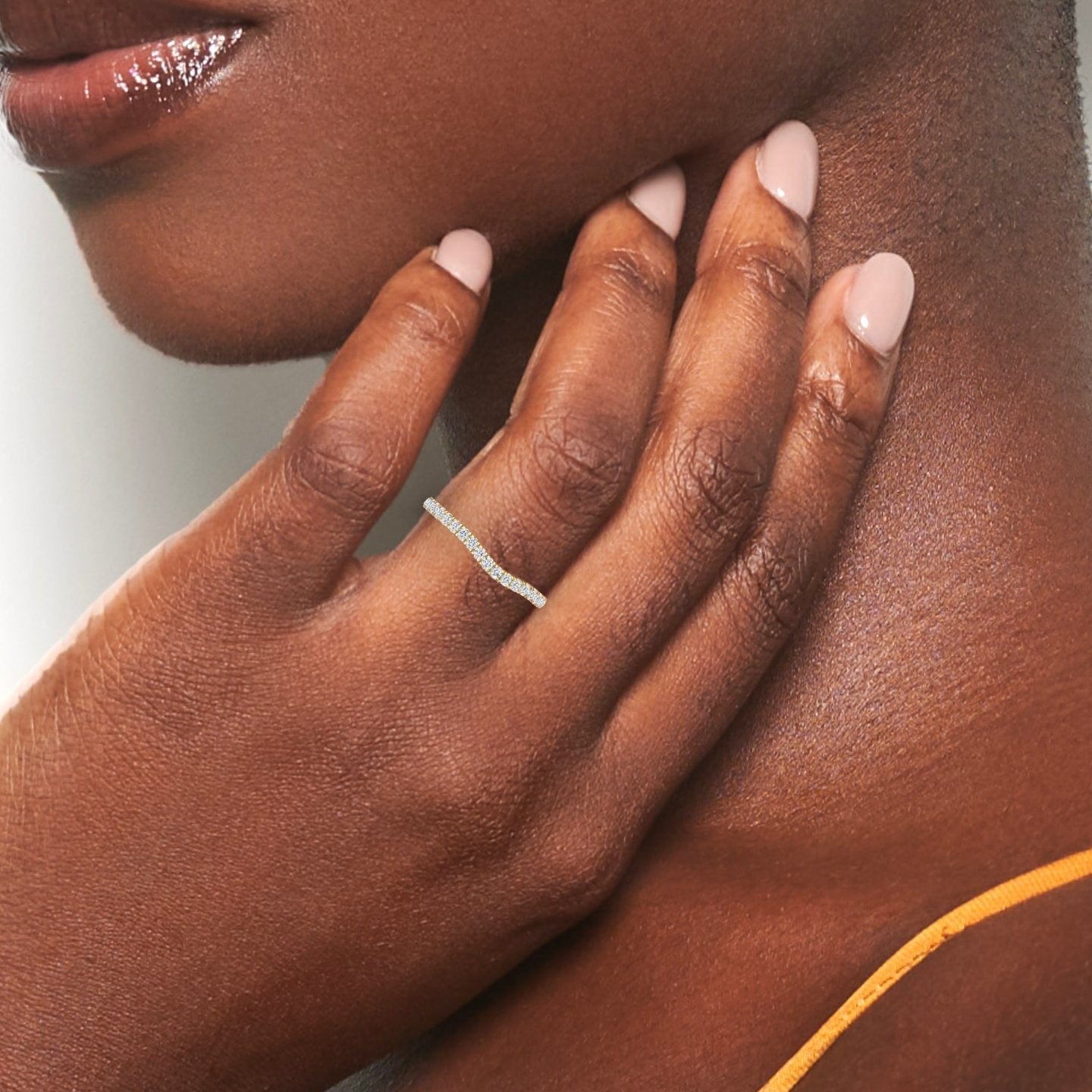 The White Diamond Three-Quarter Curved Eternity Band – Sangita showcases 27 round diamonds in a sleek, contoured setting that hugs your engagement ring or shines solo. Crafted in your choice of 18K white, rose, yellow, blackened gold, or platinum, it’s a timeless stacking essential.
