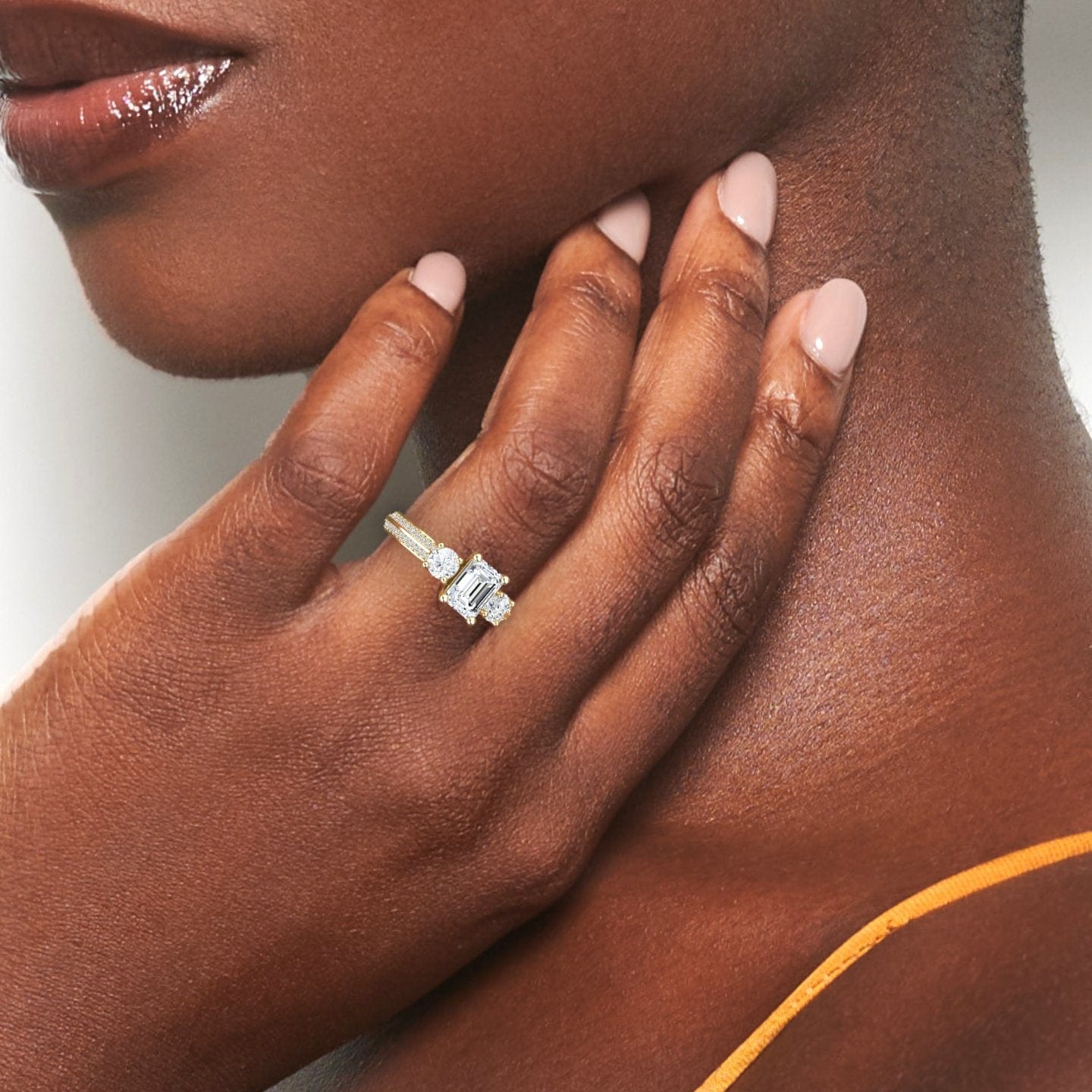 The Brianna engagement ring features a striking three-stone setting with a brilliant center diamond flanked by two side stones, set atop a double row of pave-set diamonds for maximum sparkle. Available in luxurious 18K White, Rose, Yellow, Blackened Gold, or Platinum, this modern classic symbolizes your past, present, and future love.