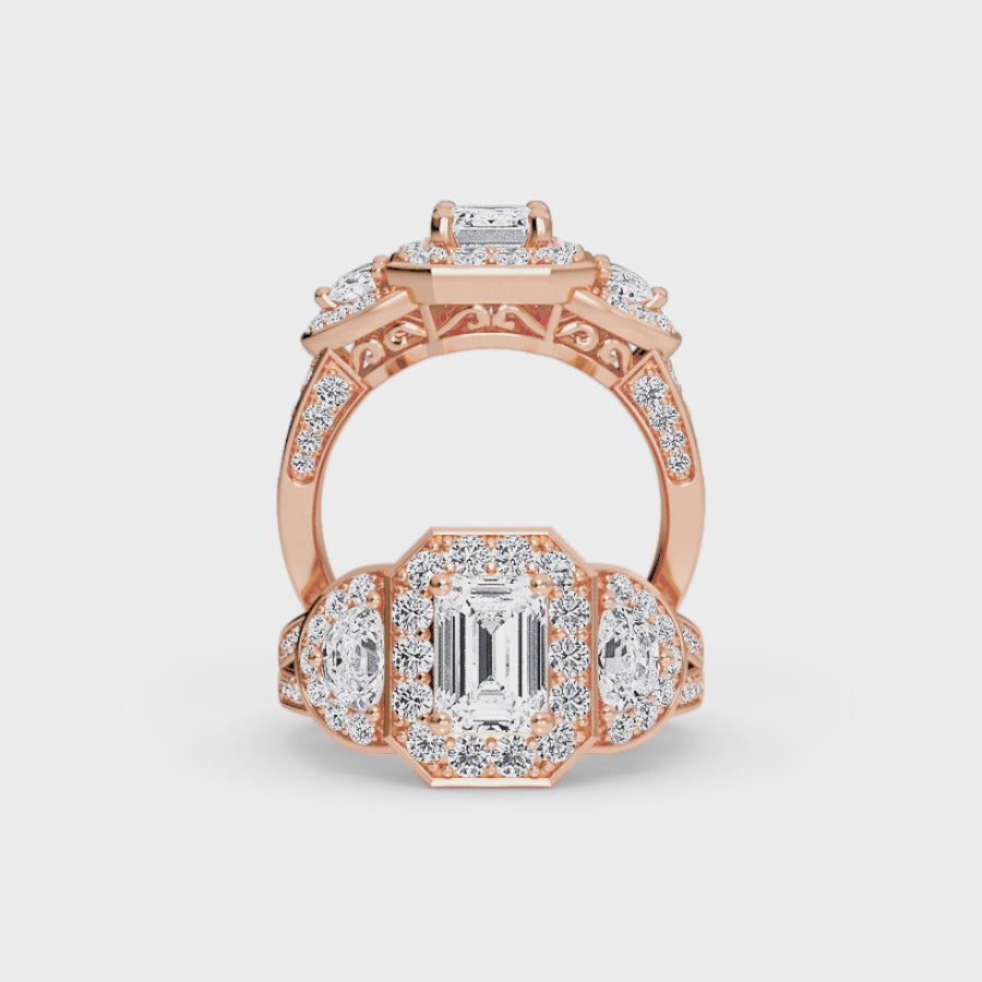Journey White Diamond Three-Stone Halo Engagement Ring