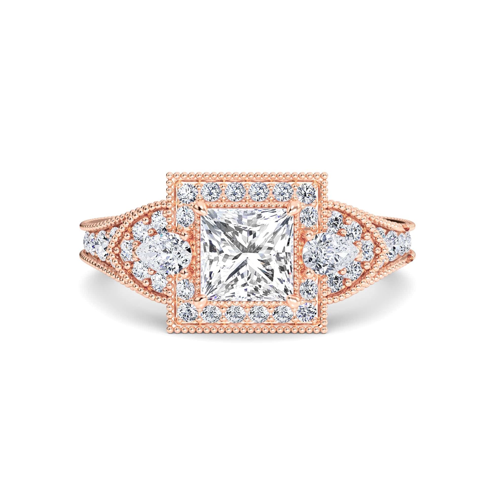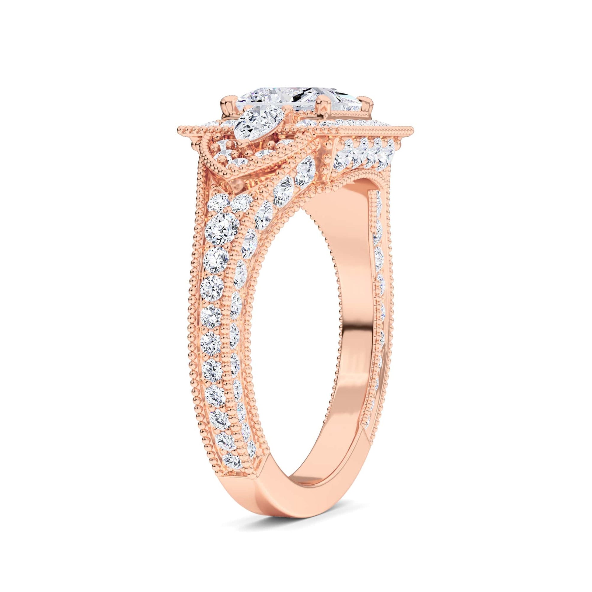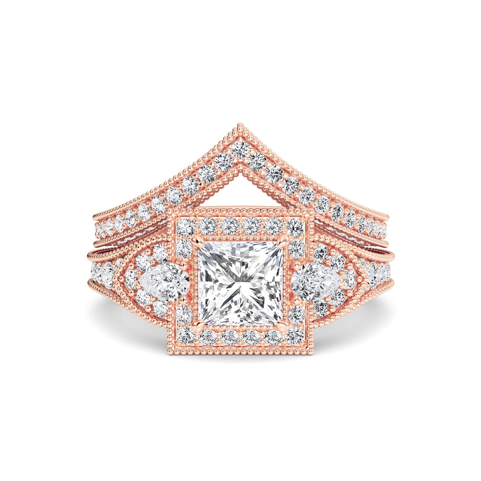Ottilie White Diamond Three Stone Halo Pave Bridal Set Engagement Ring